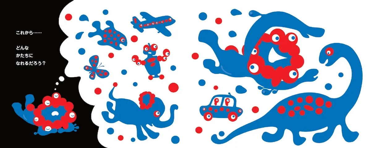 恐竜や蝶、車など、思いもよらない姿へ変化していく様子が楽しい。大胆な青と赤のコントラストがくっきり映えて、眺めるたびに物語が広がります。親子の読み聞かせや、推しの世界観を共有したい友人へのギフトにも。
