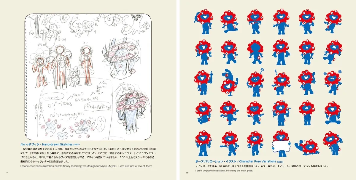 物語に加えて、作者・山下浩平さんがデザインの過程を紹介する図録も収録されています。ラフスケッチやポーズバリエーションが見られ、生まれるまでの思考や線の勢いが伝わり、「デザインってこんなにおもしろい」と感じさせてくれます。