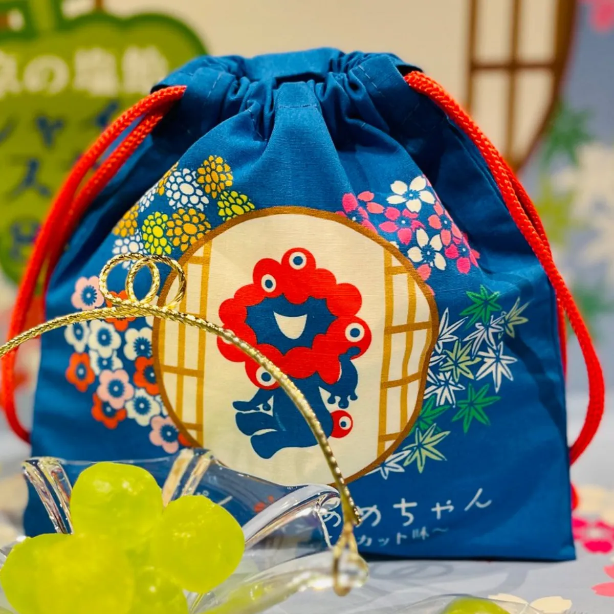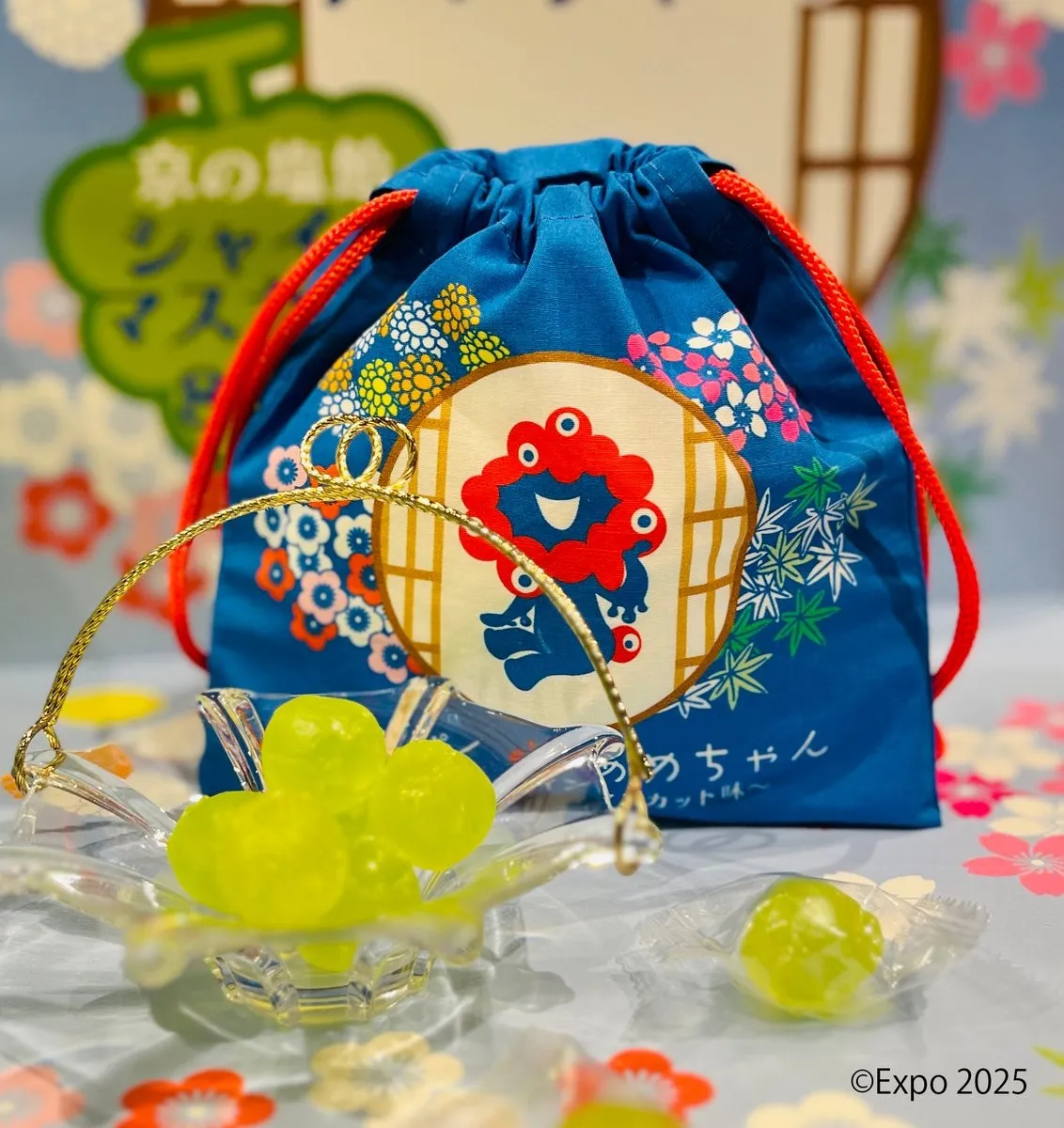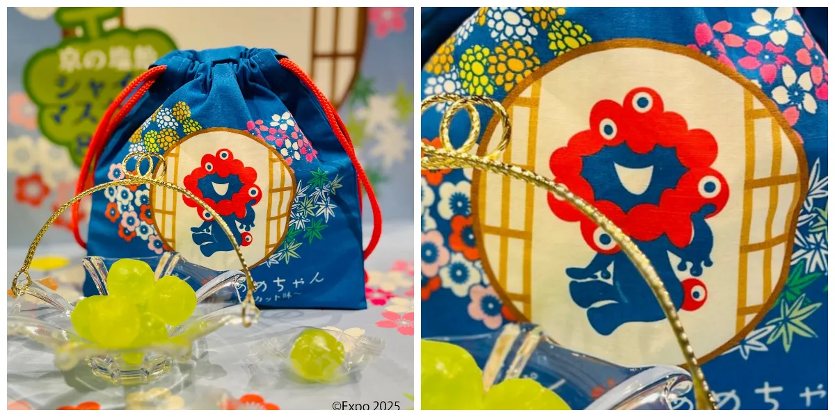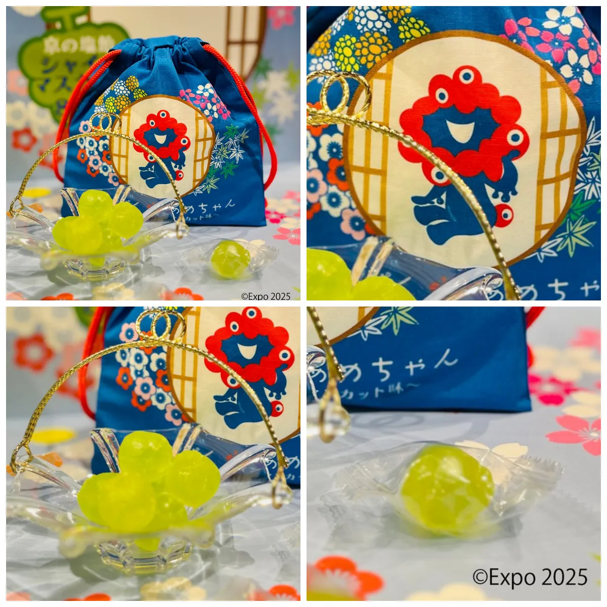 ミャクミャクのにっこり笑顔が描かれた華やかな巾着に、爽やかなシャインマスカット味のあめちゃんを詰め込んだセット。京菓子の老舗ならではの上品さとキャラクターの可愛さが一度に楽しめて、記念にもギフトにもぴったりなおみやげです。