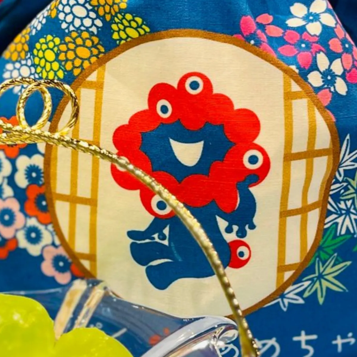 ミャクミャクの青と赤の上品な色合いに、和の花模様がちりばめられた巾着。キャラクターの可愛さと京都らしい上品さが同居していて、女性からの支持も高いデザインです。食べ終わった後は小物入れに使えるので、推し活グッズやコスメ収納にもおすすめです。