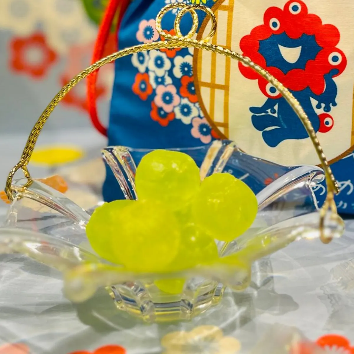 巾着の中には、フルーティーなシャインマスカット味のあめちゃんが8個入り。個包装されているのでお配りもしやすく、旅のお供やちょっとした休憩時間にもぴったり。透明感のある黄緑色がきらっと映えて、テーブルを可愛く彩ってくれます。