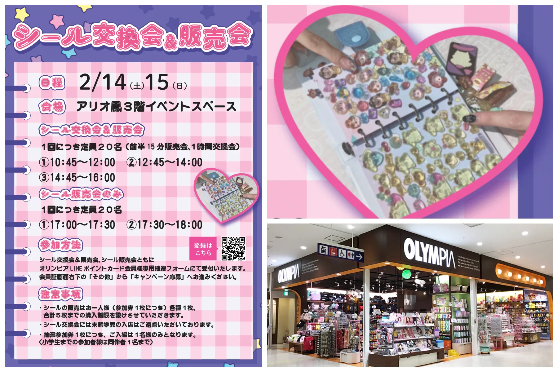 ファッションと雑貨がミックス、大人も子供もワクワクできるバラエティーショップ「オリンピア アリオ鳳店」にて、2月14日(土)~2月15日(日)の期間限定で、第2回「アリオ鳳 シール交換会&販売会」の開催が決定!