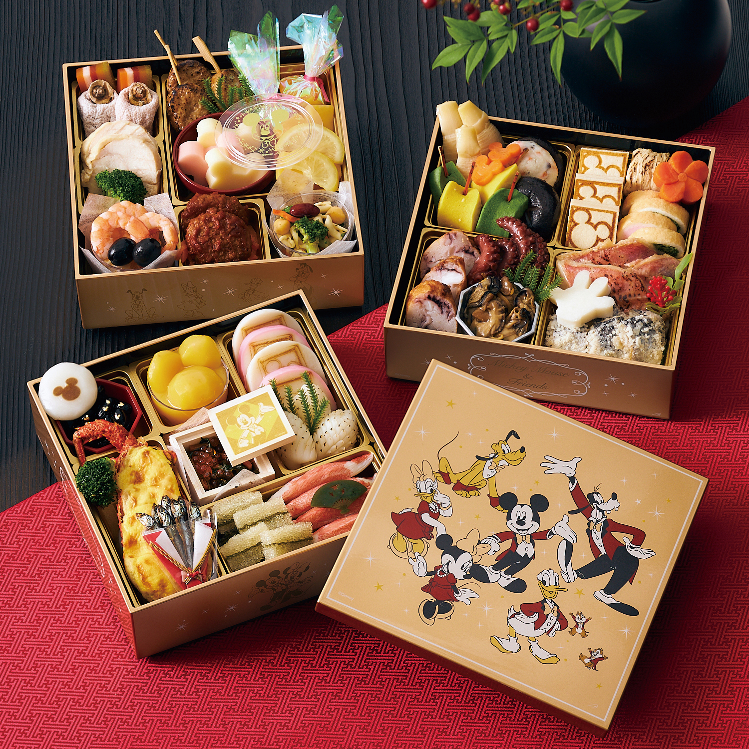 ミッキー&フレンズがキュートな朱塗りの三段重に、59品目52種 4人×3食分が賑やかに盛り込まれています。※オリジナルグッズ特典付き