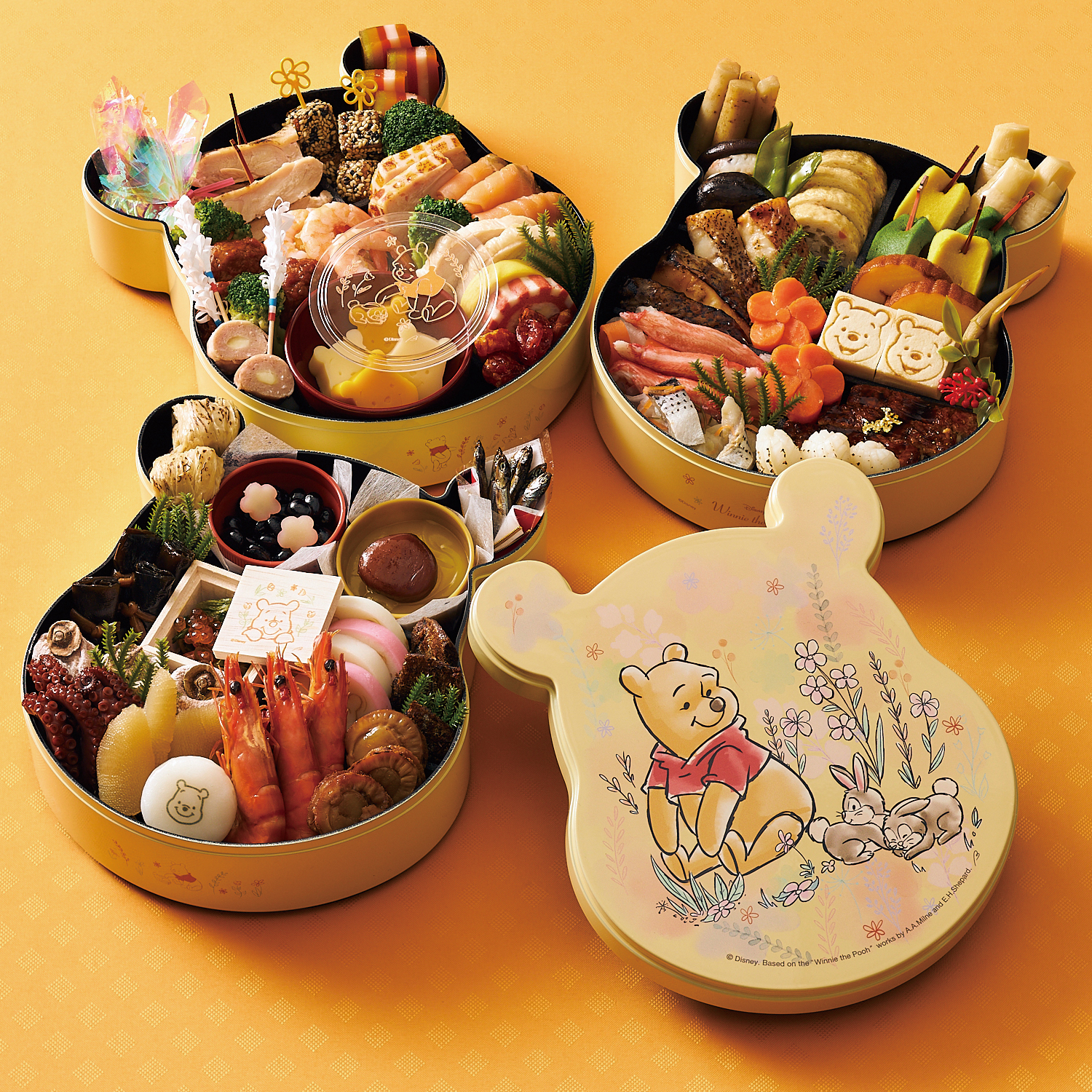 うさぎ年にちなんだ優しいタッチのデザインに癒される、くまのプーさんの三段重。56品目50種 4人×3食分が彩り豊かに盛り込まれています。※オリジナルグッズ特典付き