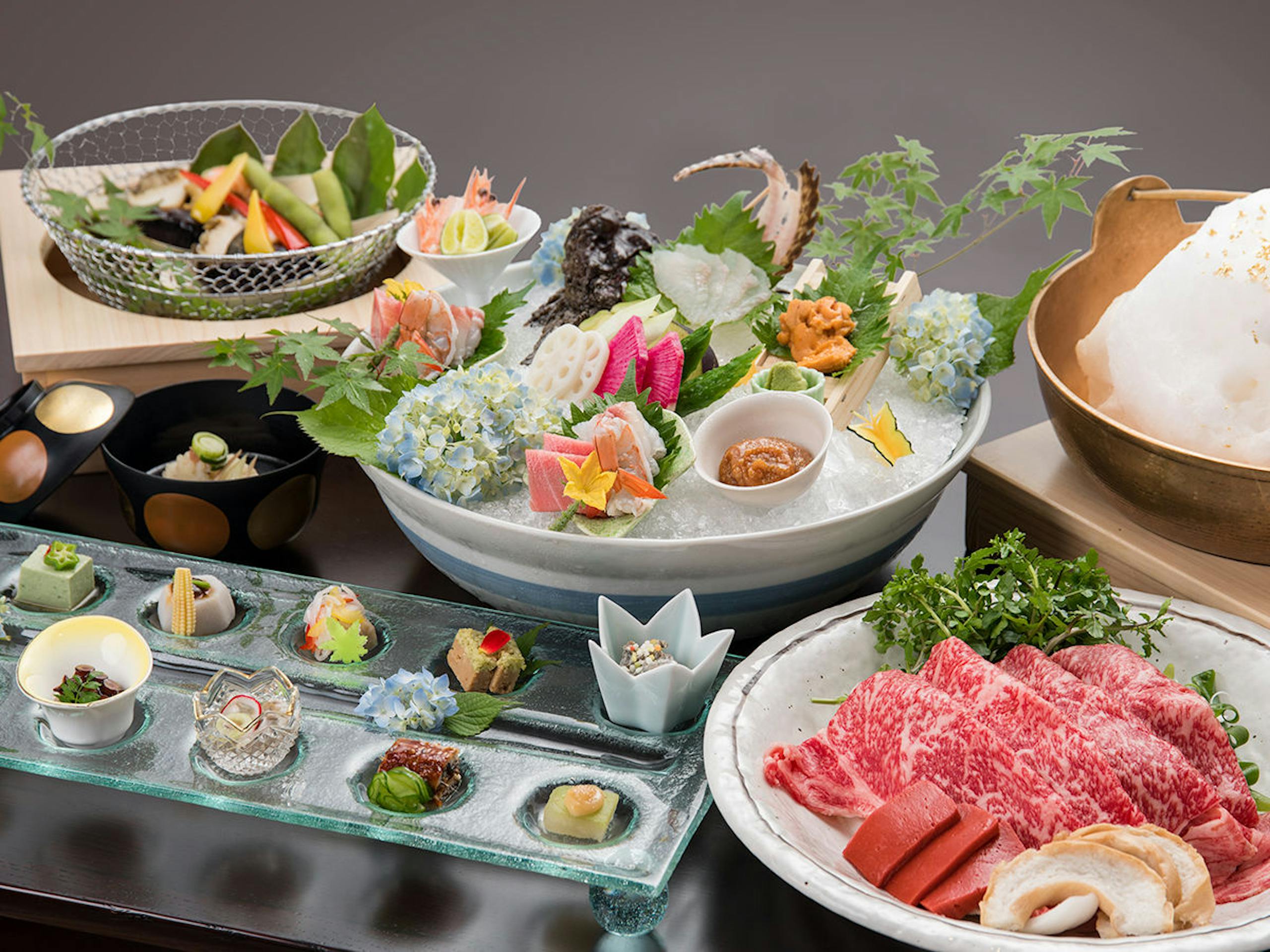 「五感で食す」をコンセプトにした自慢の客前料理。名物の綿雨を雲にみたてた牛すき焼き『雲海鍋』を筆頭に、目の前で繰り広げられるライブ感あふれる板前パフォーマンスに大きな拍手と歓声が湧き上がります。目で、耳で、舌で味わう、美味しさとエンターテイメント性を兼ね備えた料理の数々は、訪れるゲストを魅了してやみません。
