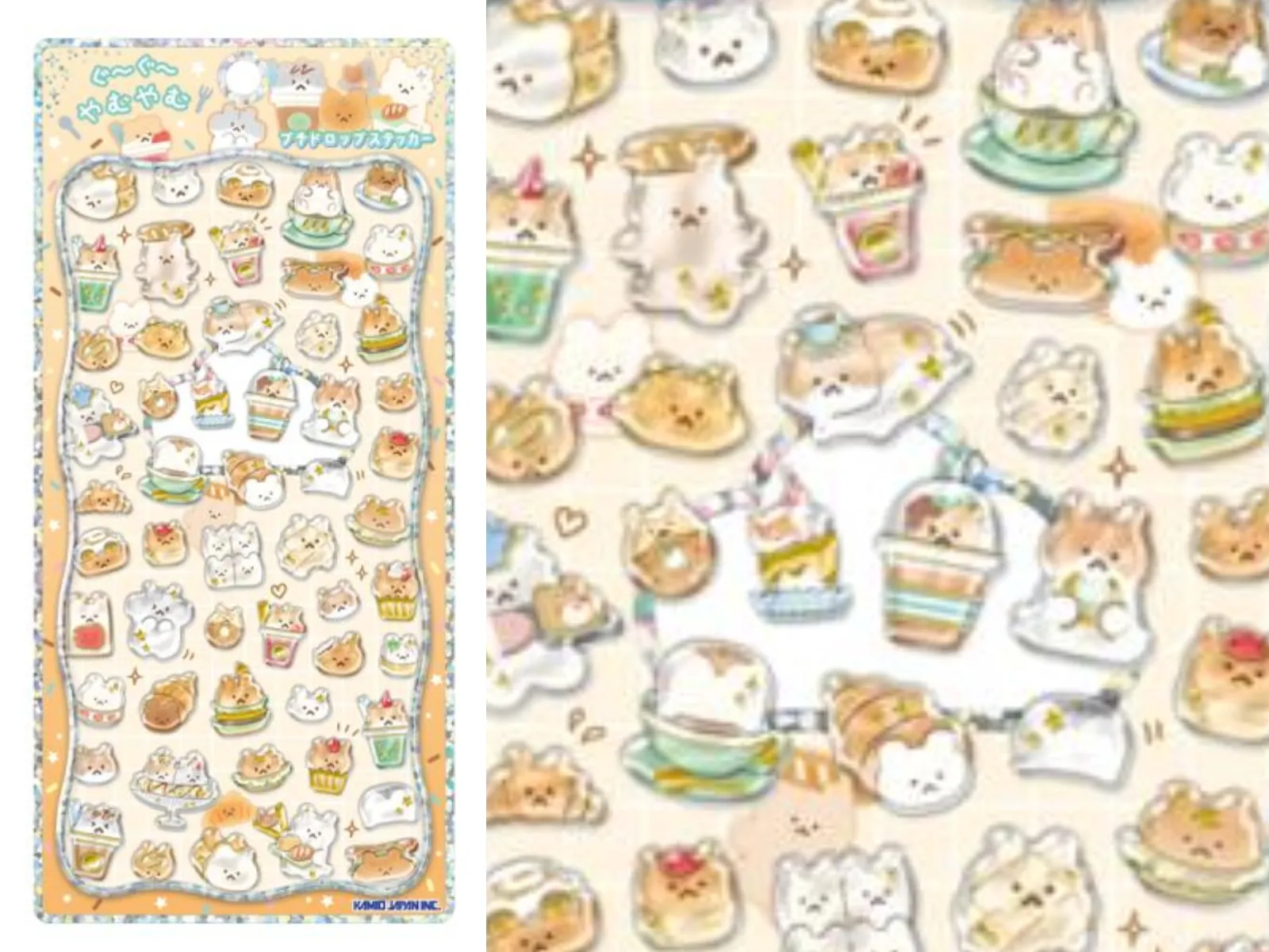 まるでキラキラ宝石みたい!ぷっくりちゅるんな立体シール「プチドロップステッカー」から「ぐーぐーやむやむ」デザイン。お腹がすいて「ぐーぐー」、美味しいものを食べて「やむやむ」で愛らしさたっぷり!色々なサイズのシールがあるからデコにもバッチリ!
