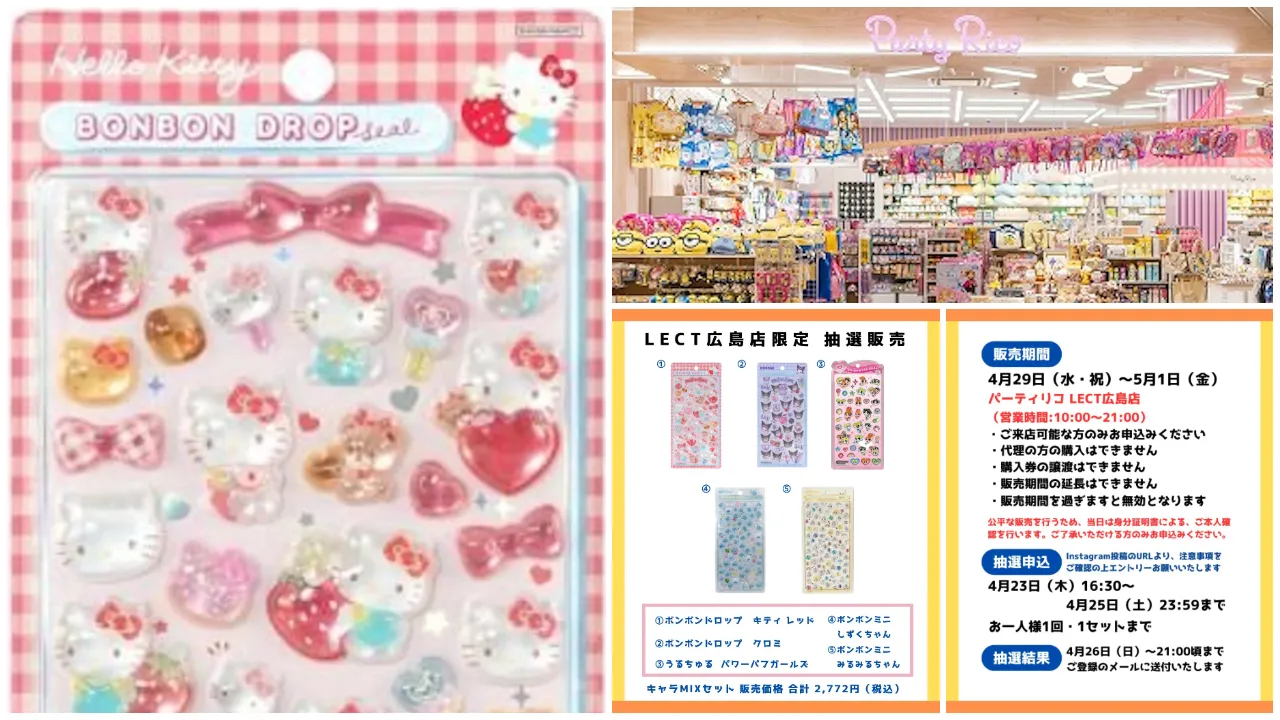 広島県近郊のシール好きさん集まれ〜!かわいいキャラクターグッズに出会える雑貨店「パーティリコ LECT(レクト)広島店」にて、2026年4月29日(水・祝)〜2026年5月1日(金)の期間限定で、ボンボンドロップシール・うるちゅるポップシールの抽選販売が決定しました!気になる商品情報や抽選エントリー方法などを詳しくご紹介しますので、ぜひチェックしてみてください。