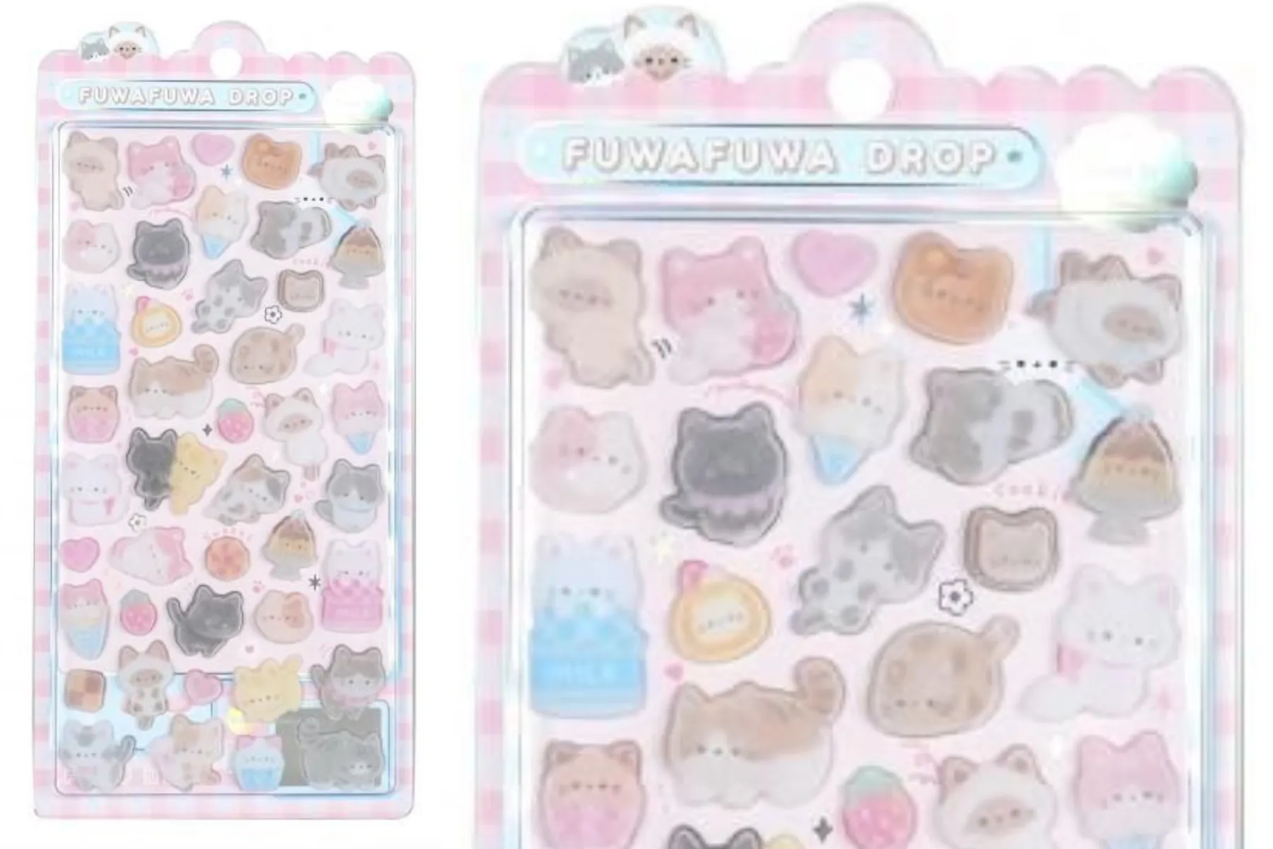 ぷっくり&フロッキー加工のボンドロ「ふわふわドロップシリーズ」より『ねこねこふわふわ』。猫ちゃんたちの毛並みが、フロッキー素材で可愛く表現されています。猫好きさんとのシール交換にも◎。