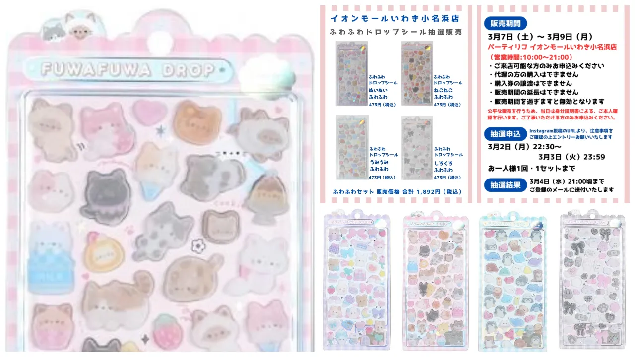 福島県近郊のシール好きさん集まれ〜!かわいいキャラクターグッズに出会える雑貨店「パーティリコ イオンモールいわき小名浜店 (福島県)」にて、2026年3月7日(土)〜3月9日(月)の期間限定で、ボンボンドロップシール「ふわふわドロップシリーズ」の抽選販売が決定しました!気になる商品情報や抽選エントリー方法などを詳しくご紹介しますので、ぜひチェックしてみてください。