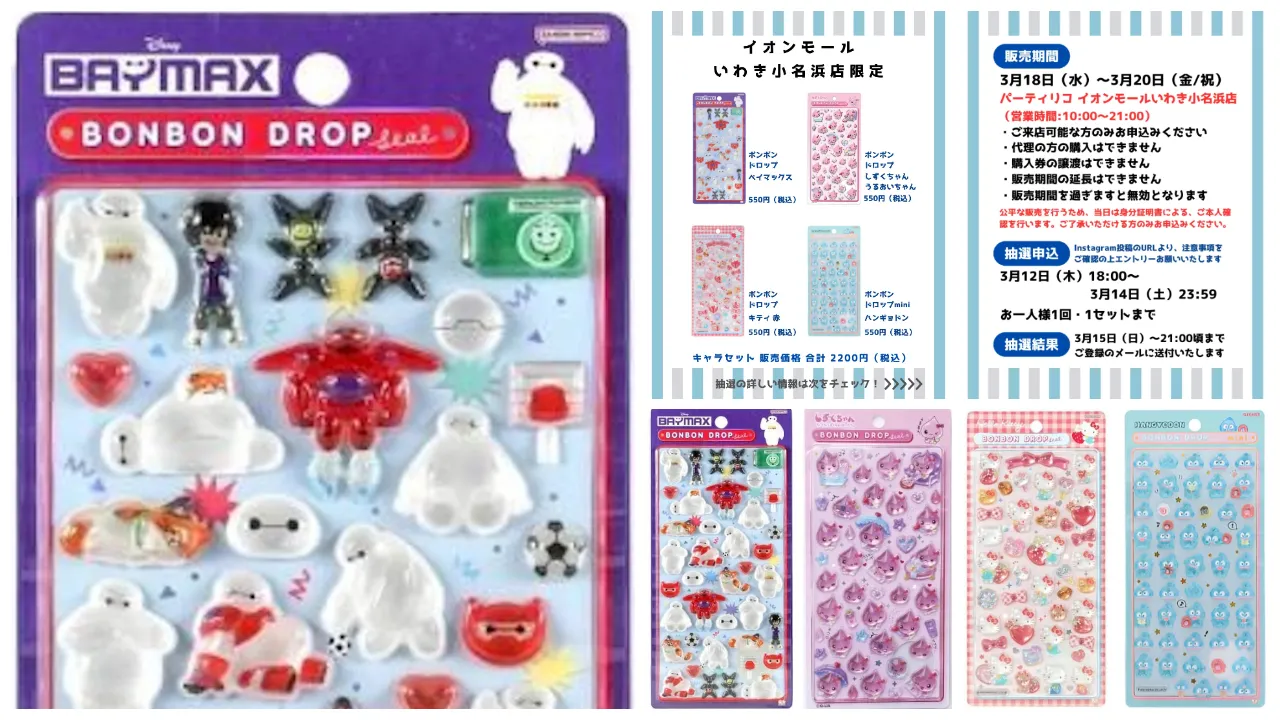 福島県近郊のシール好きさん集まれ〜!かわいいキャラクターグッズに出会える雑貨店「パーティリコ イオンモールいわき小名浜店 (福島県)」にて、2026年3月18日(水)〜3月20日(金・祝)の期間限定で、ボンボンドロップシールの抽選販売が決定しました!「ベイマックス」「うるおいちゃん」「ハローキティ」「ハンギョドン」のキャラセットが登場します。気になる商品情報や抽選エントリー方法などを詳しくご紹介しますので、ぜひチェックしてみてください。