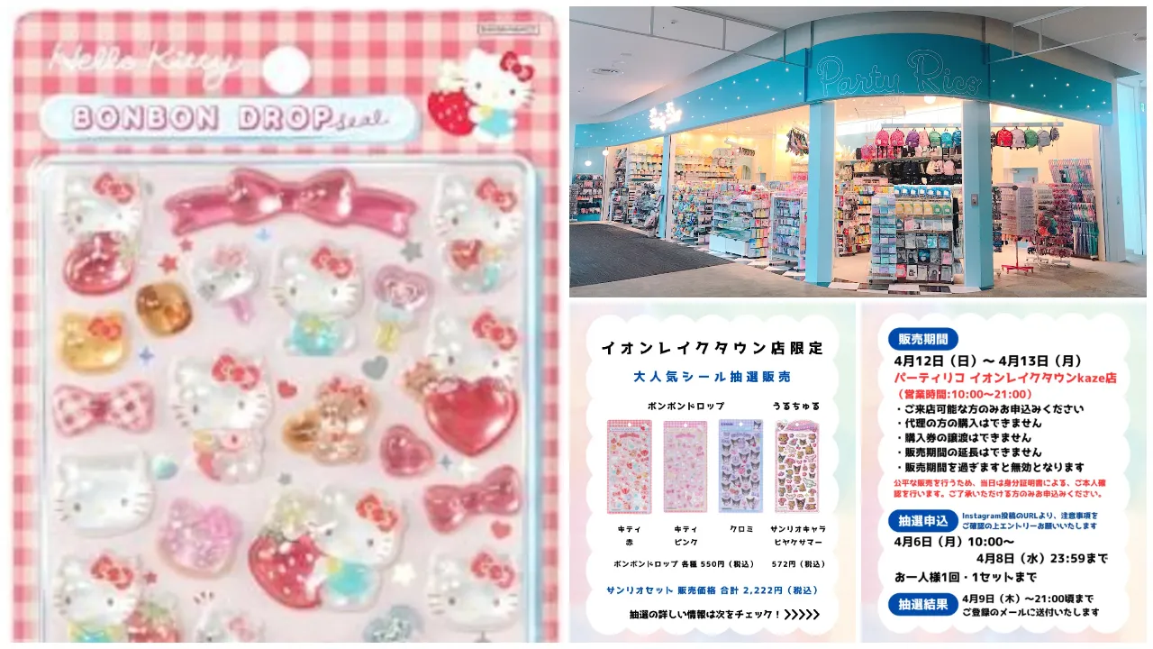 埼玉県近郊のシール好きさん&サンリオ好きさん集まれ〜!かわいいキャラクターグッズに出会える雑貨店「パーティリコ イオンレイクタウンkaze店(埼玉県)」にて、2026年4月12日(日)~4月13日(月)の期間、ボンボンドロップシール&うるちゅるポップシールの抽選販売が決定しました!パーティリコ厳選のサンリオセットが登場します。気になる商品情報や抽選エントリー方法などを詳しくご紹介しますので、ぜひチェックしてみてください。