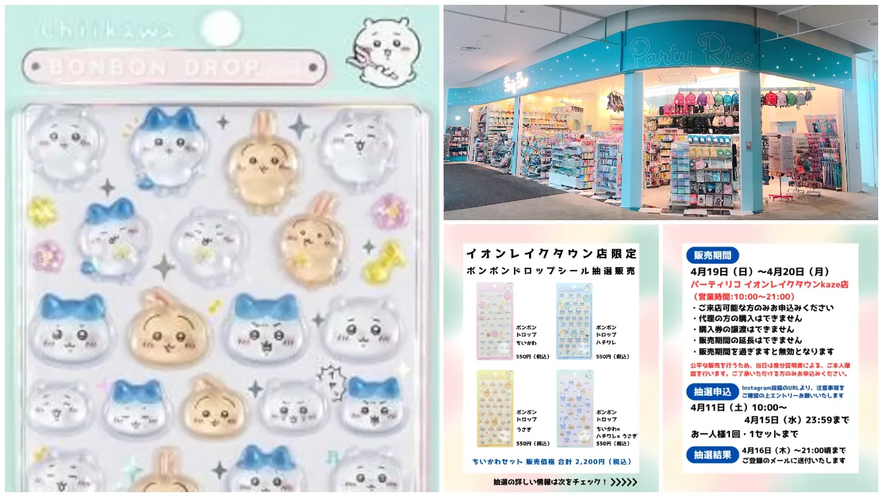 埼玉県近郊のシール好きさん&ちいかわ好きさん集まれ〜!かわいいキャラクターグッズに出会える雑貨店「パーティリコ イオンレイクタウンkaze店(埼玉県)」にて、2026年4月19日(日)~4月20日(月)の期間限定で、ボンボンドロップシール「ちいかわ 第1弾」の抽選販売が決定しました!気になる商品情報や抽選エントリー方法などを詳しくご紹介しますので、ぜひチェックしてみてください。