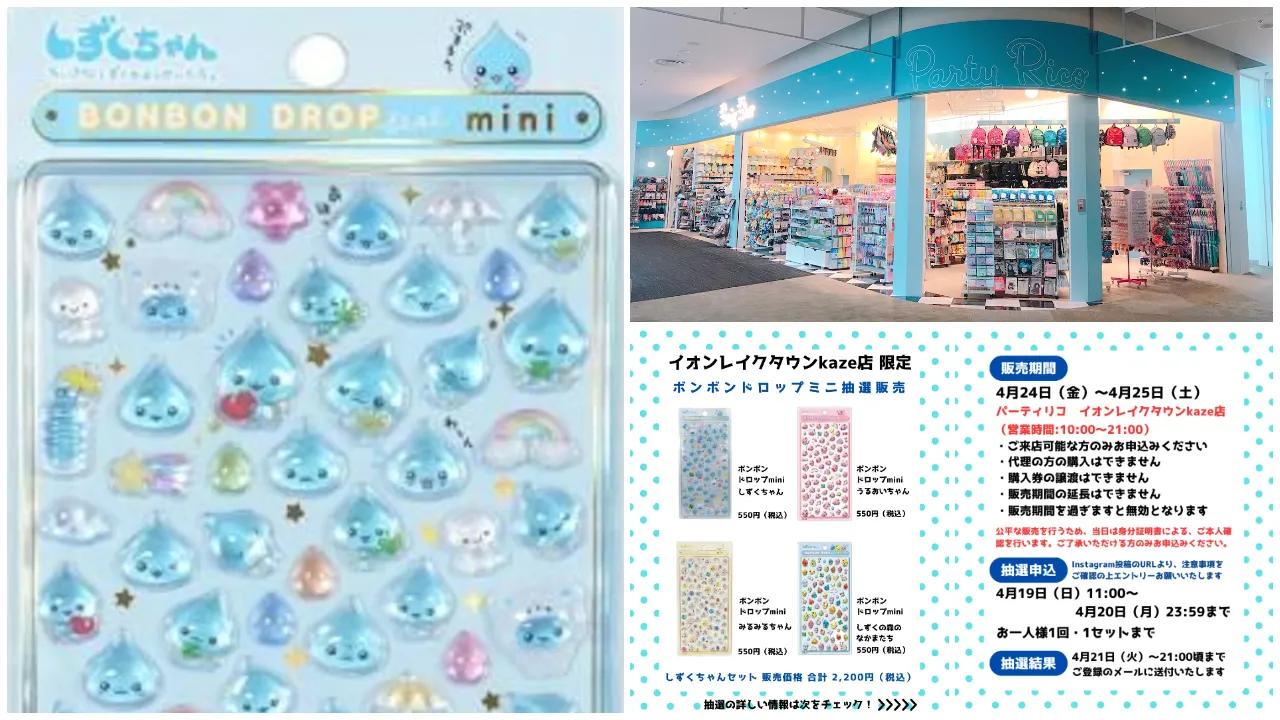 埼玉県近郊のシール好きさん集まれ〜!かわいいキャラクターグッズに出会える雑貨店「パーティリコ イオンレイクタウンkaze店(埼玉県)」にて、2026年4月24日(金)~4月25日(土)の期間限定で、ボンボンドロップシールmini「しずくちゃん4種セット」の抽選販売が決定しました!気になる商品情報や抽選エントリー方法などを詳しくご紹介しますので、ぜひチェックしてみてください。