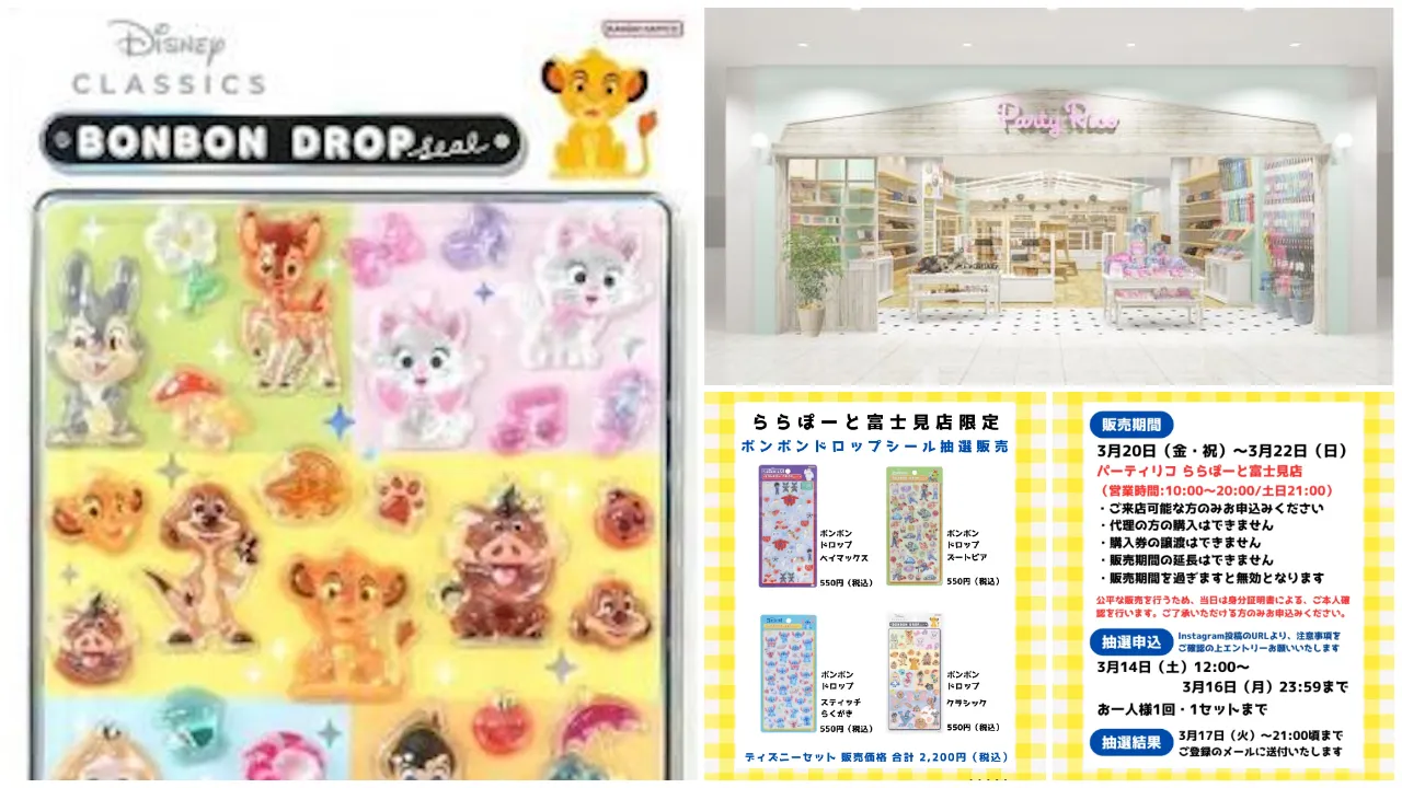 埼玉県近郊のシール好きさん&ディズニーファン集まれ〜!かわいいキャラクターグッズに出会える雑貨店「パーティリコ ららぽーと富士見店 (埼玉県)」にて、2026年3月20日(金・祝)〜2026年3月22日(日)の期間限定で、「ボンボンドロップシール ディズニー第2弾」の抽選販売が決定しました!気になる商品情報や抽選エントリー方法などを詳しくご紹介しますので、ぜひチェックしてみてください。