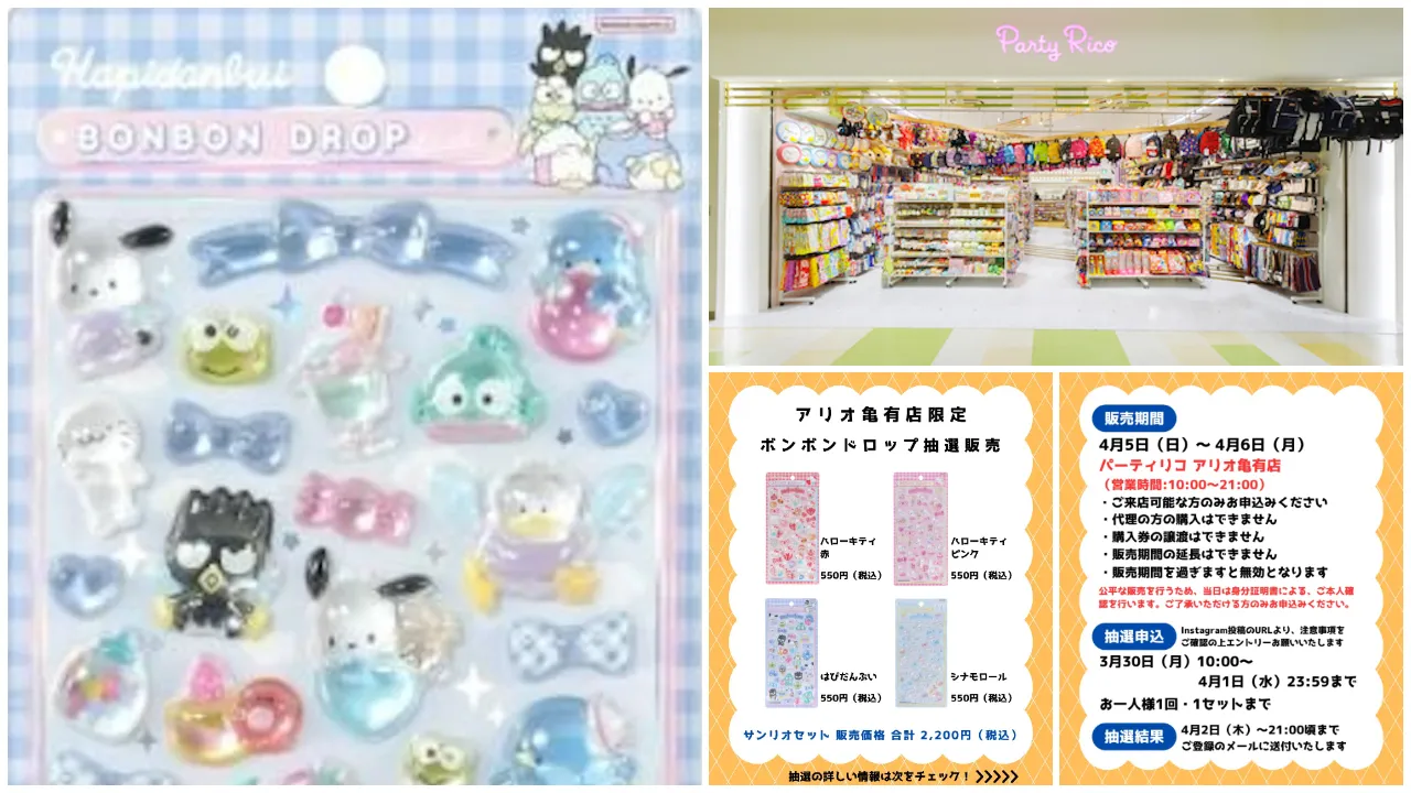 東京近郊のシール好きさん集まれ〜!かわいいキャラクターグッズに出会える雑貨店「パーティリコ アリオ亀有店(東京都葛飾区)」にて、2026年4月5日(日)〜4月6日(月)の期間限定でボンボンドロップシール「サンリオ第2弾」の抽選販売が決定しました!気になる商品情報や抽選エントリー方法などを詳しくご紹介しますので、ぜひチェックしてみてください。