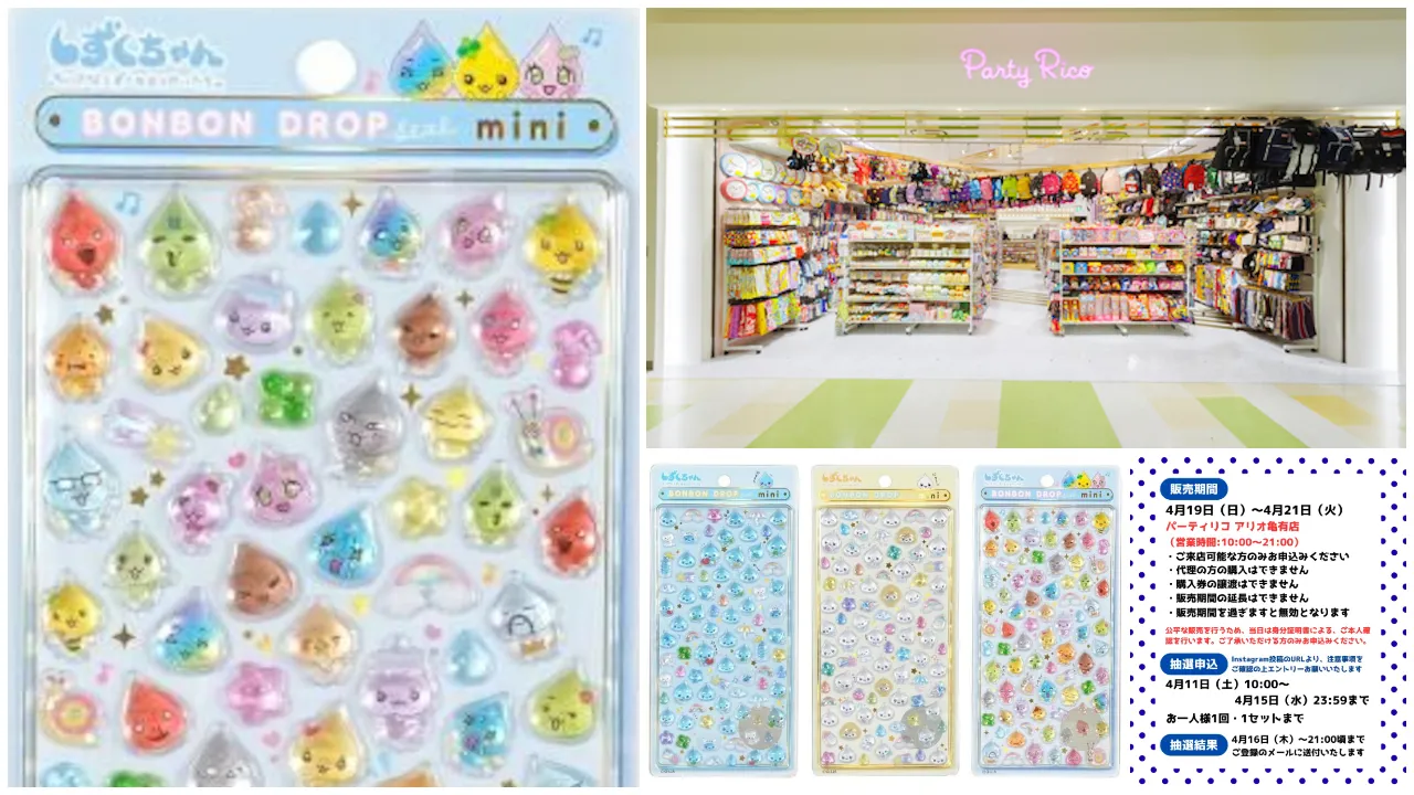 東京近郊のシール好きさん集まれ〜!かわいいキャラクターグッズに出会える雑貨店「パーティリコ アリオ亀有店(東京都葛飾区)」にて、2026年4月19日(日)〜4月21日(火)の期間限定で「ボンボンドロップシールmini しずくちゃん」の抽選販売が決定しました!気になる商品情報や抽選エントリー方法などを詳しくご紹介しますので、ぜひチェックしてみてください。