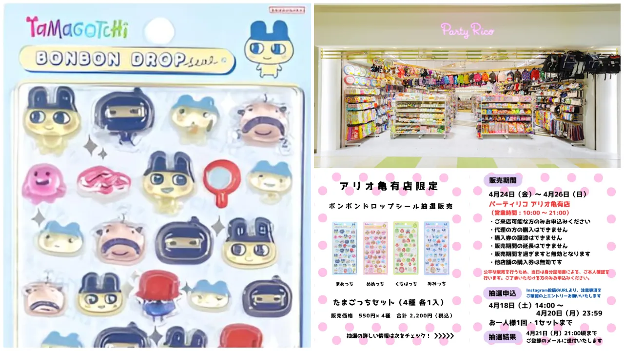 東京近郊のシール好きさん集まれ〜!かわいいキャラクターグッズに出会える雑貨店「パーティリコ アリオ亀有店(東京都葛飾区)」にて、2026年4月24日(金)〜4月26日(日)の期間限定で「ボンボンドロップシール たまごっち」の抽選販売が決定しました!気になる商品情報や抽選エントリー方法などを詳しくご紹介しますので、ぜひチェックしてみてください。