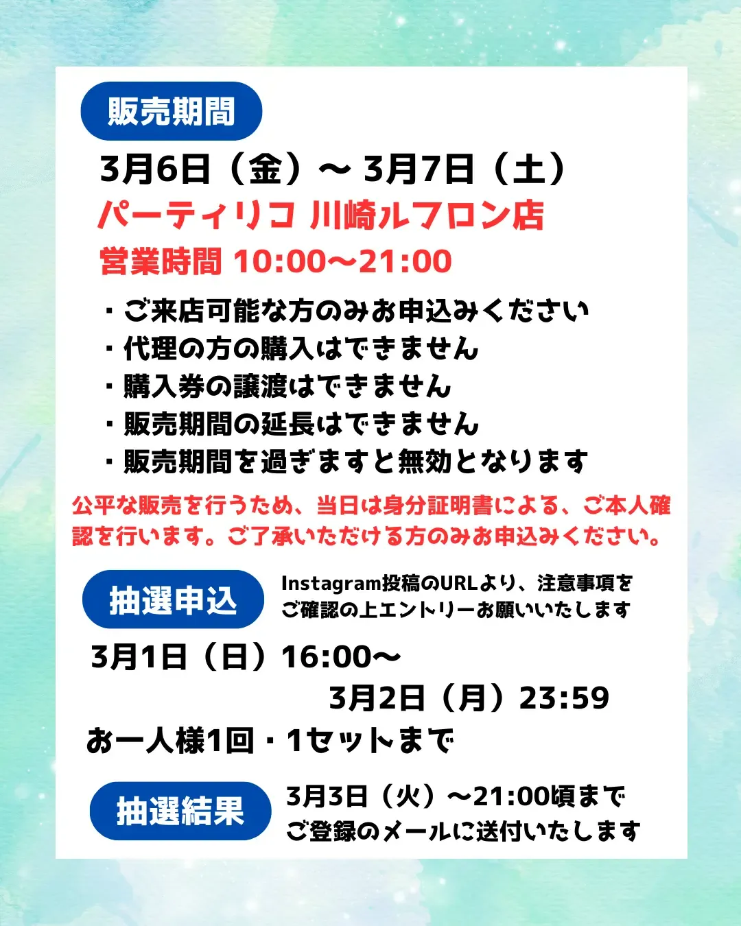 ※抽選販売に関する店舗へのお問い合わせはご遠慮ください。