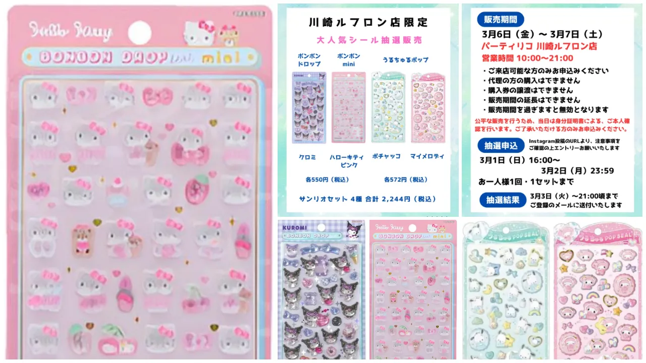 神奈川県近郊のシール好きさん&サンリオ好きさん集まれ〜!かわいいキャラクターグッズに出会える雑貨店「パーティリコ 川崎ルフロン店」にて、2026年3月6日(金)〜2026年3月7日(土)の期間限定で、「ボンボンドロップシール&うるちゅるポップシール サンリオセット」の抽選販売が決定しました!気になる商品情報や抽選エントリー方法などを詳しくご紹介しますので、ぜひチェックしてみてください。