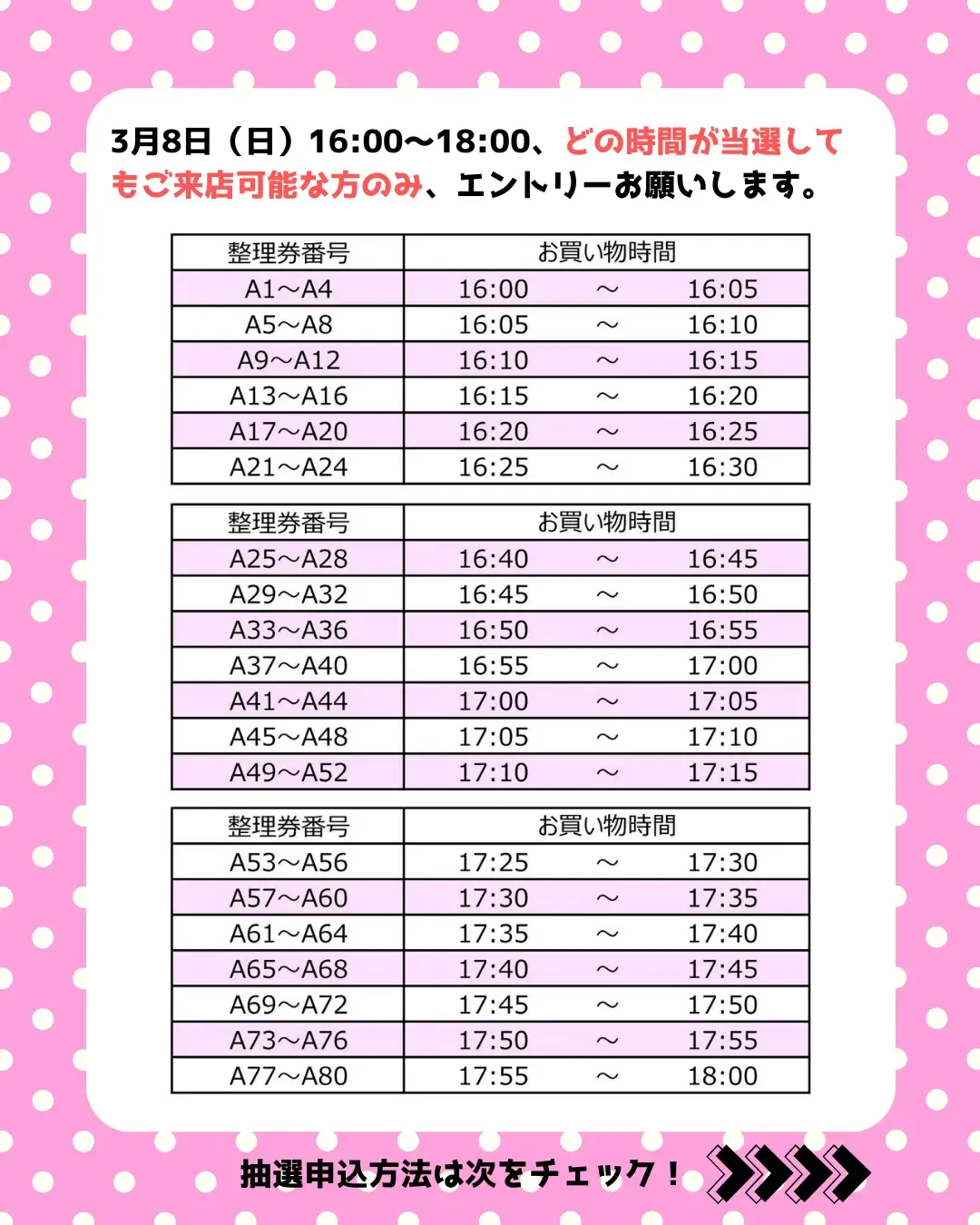 ※入場時間のご希望は承れません。当選整理券の時間も変更もいたしかねます。