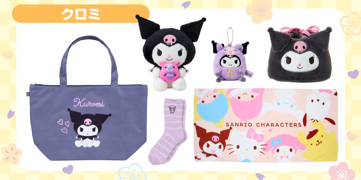自称マイメロディのライバル、黒いずきんとピンクのどくろがチャームポイントの『クロミ』の福袋2026。大容量トートバッグの中に、クロミの2026年の年号入り干支ぬいぐるみ、マスコットホルダー、モコモコルームソックスのほか、いろいろなアイテムが入った豪華セット♪