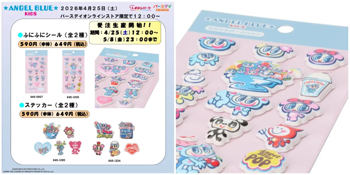 今回ご紹介した「エンジェルブルーキッズ」の立体シール&ステッカーは、4月25日(土)12:00~5月8日(金)23:00の期間、バースデイの公式オンラインストア「しまむらパーク」にて受注予約受付中です。