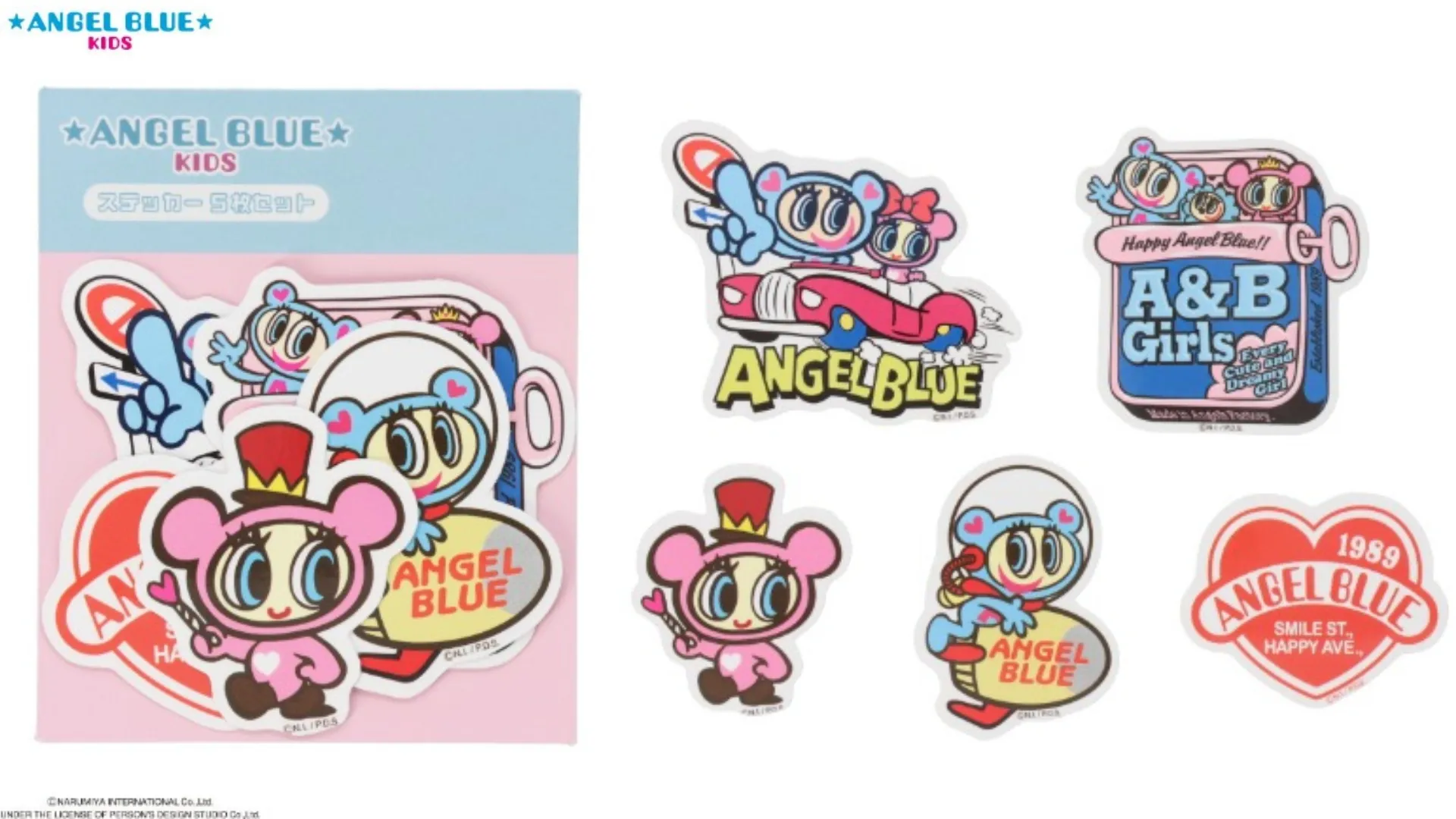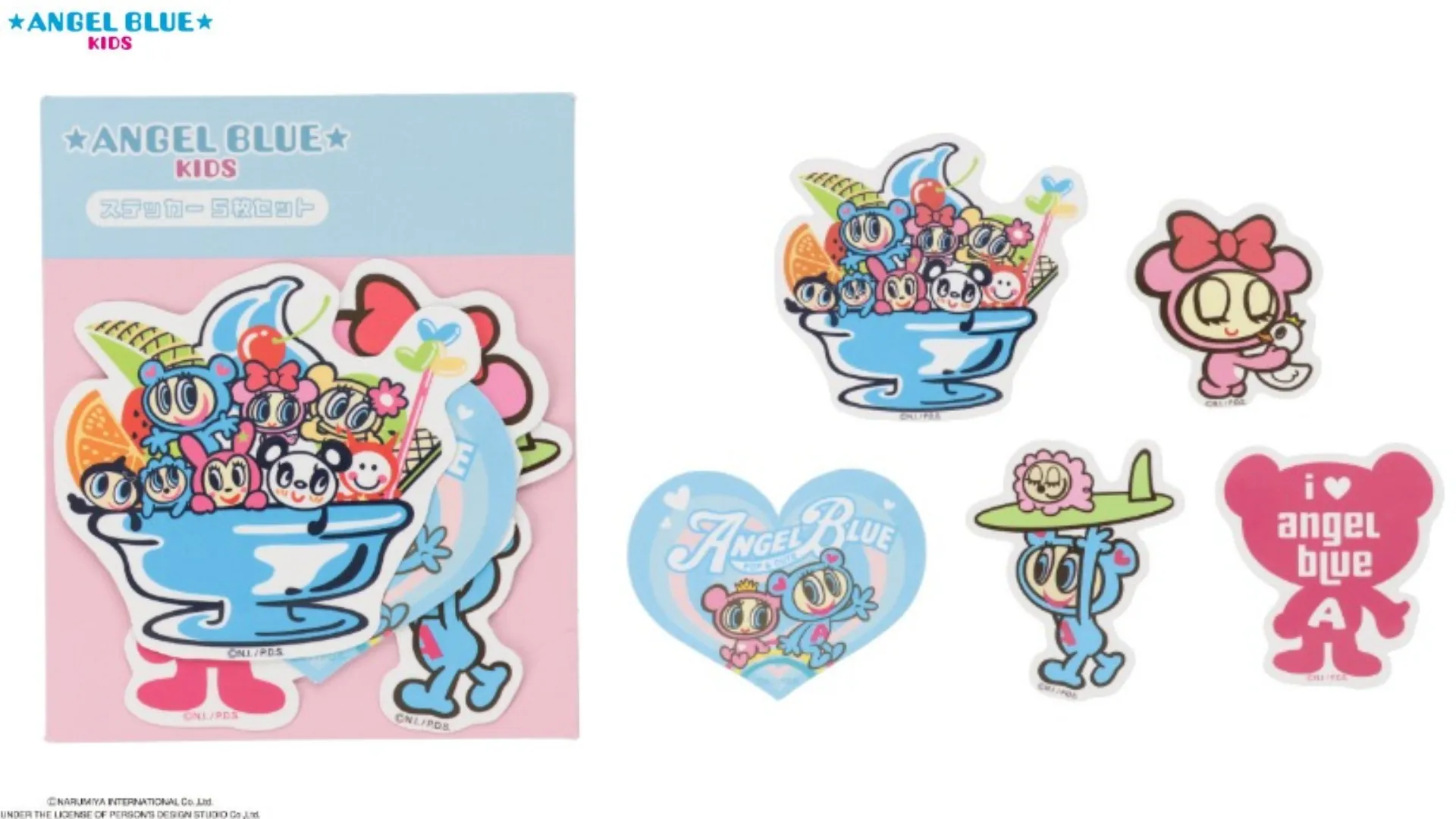 エンジェルブルーキッズのかわいいステッカー5枚組セット。平成レトロな新しくも懐かしいデザインがとってもキュート!異なる5柄のステッカーがセットになっています。