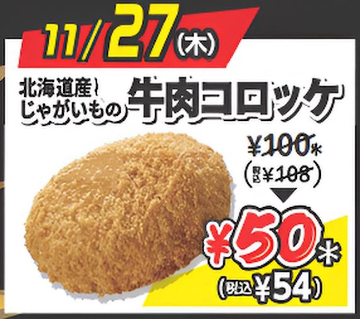 衣のサクサク感と、北海道産じゃがいものホクホクした味わいが楽しめるコロッケ。牛肉の旨みがほんのり効いていて、夕食のもう一品や軽くつまみたい時にもぴったりです。ブラックフライデーセールで、11月27日(木)限定で半額に!