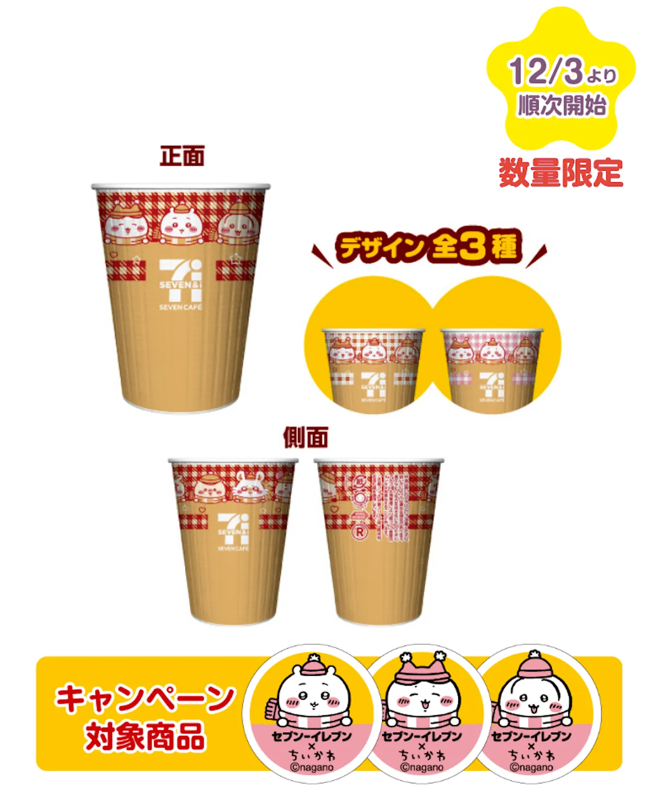 セブンカフェのホットカフェラテも、冬だけのちいかわデザインカップに。カップのデザインは、2種類から3種類に増えました!ホットカフェラテRとホットカフェラテLのご購入時に楽しめます。