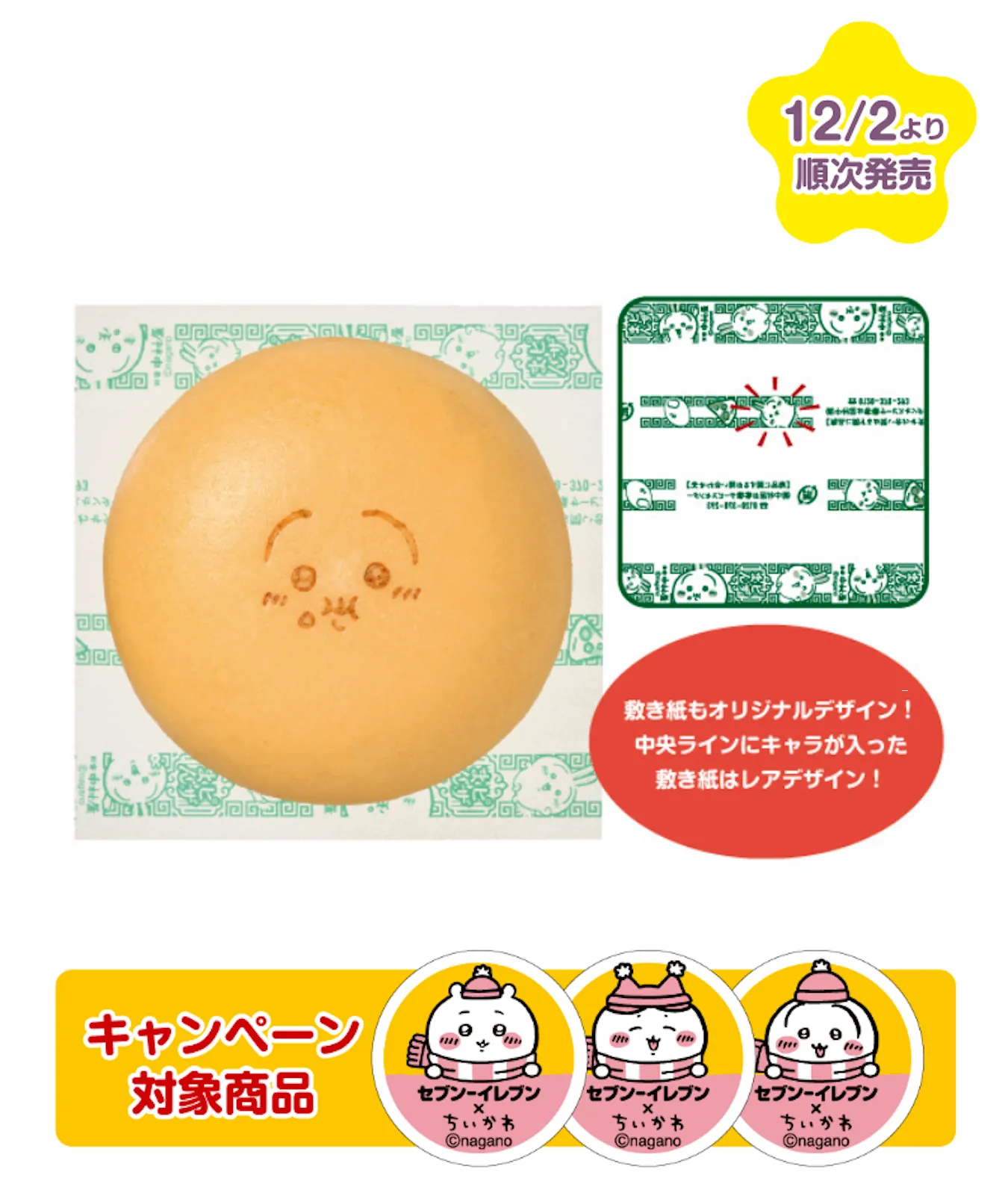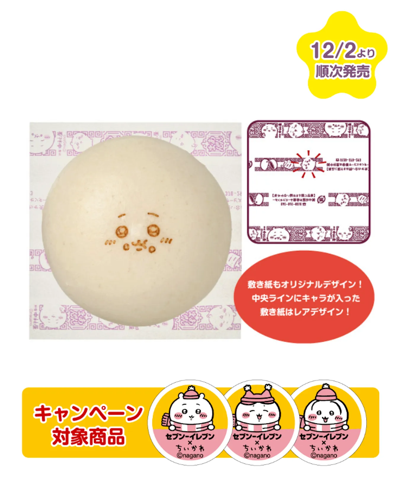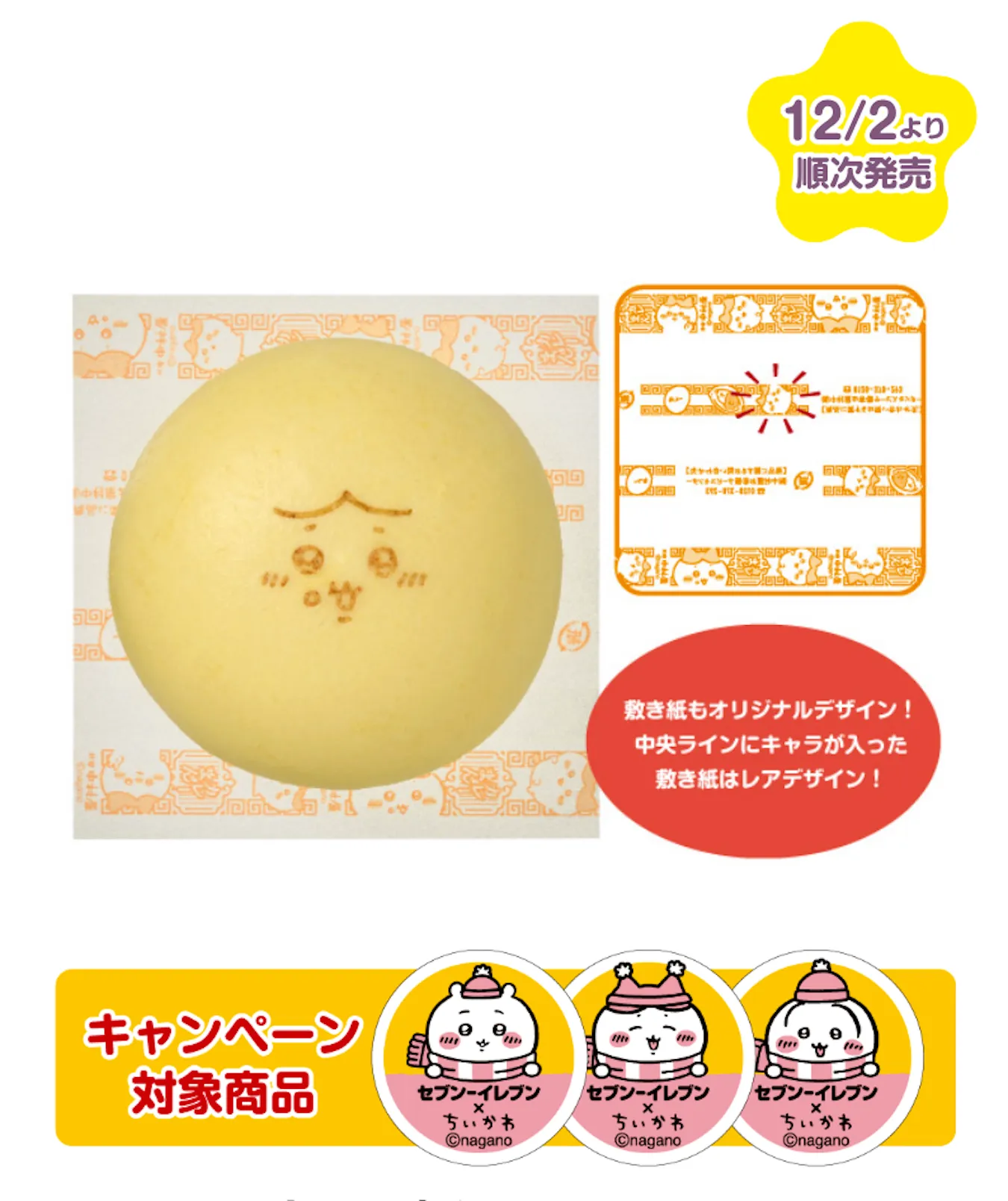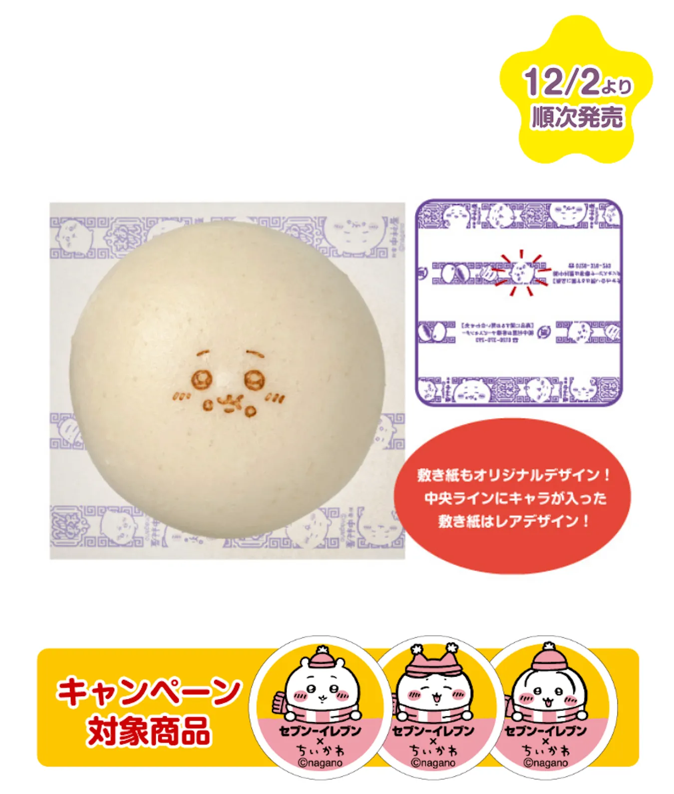 昨年SNSで話題となったちいかわコラボの中華まんが今年も数量限定で登場。ちいかわの焼印、敷紙を新デザインにリニューアル。いつもの美味しさそのままに「ちいかわ」デザインに。ごまの風味が豊かでとろっとなめらかな食感のあんを、ふわふわ生地で包みました。