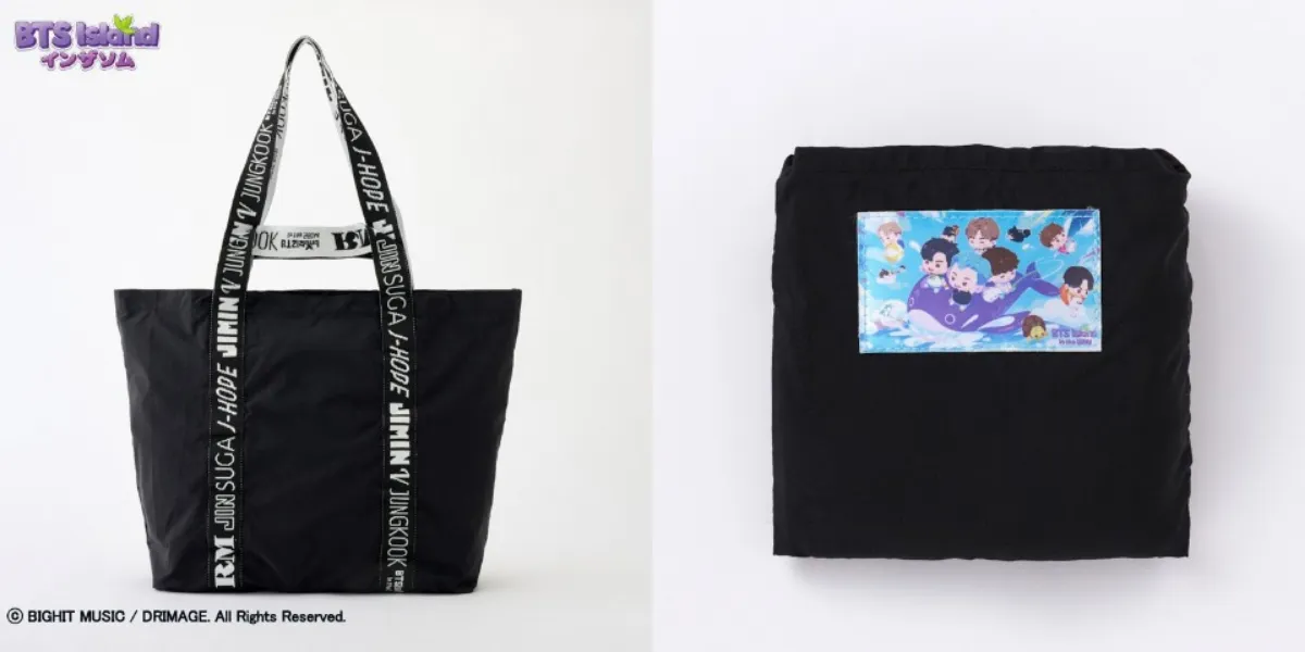 「BTS Island:インザソム」のポケッタブルトートバッグ。大人っぽいブラックカラーで普段使いにも◎。内側のポケットに本体が収納できるポケッタブルタイプ。ライブ遠征のお土産バッグにも活躍してくれそうです。
