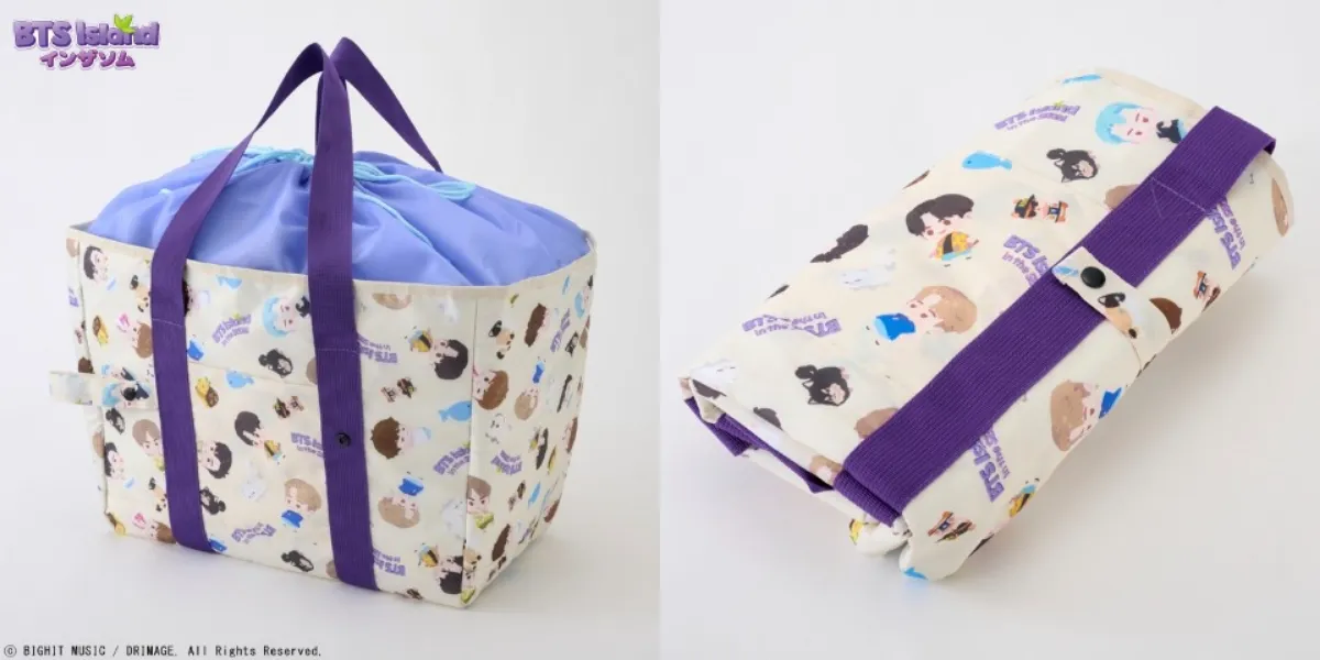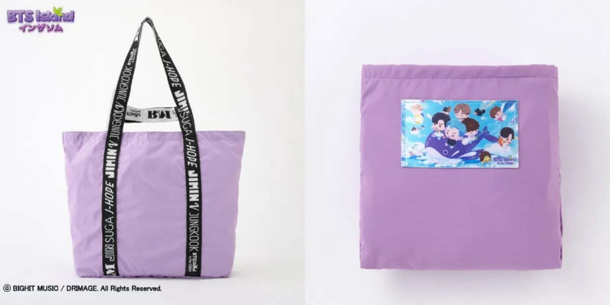 「BTS Island:インザソム」のポケッタブルトートバッグ。BTSとARMYにとって大切な推し色「紫」がおしゃれ!内側のポケットに本体が収納できるポケッタブルタイプ。ライブ遠征のお土産バッグにも活躍してくれそうです。