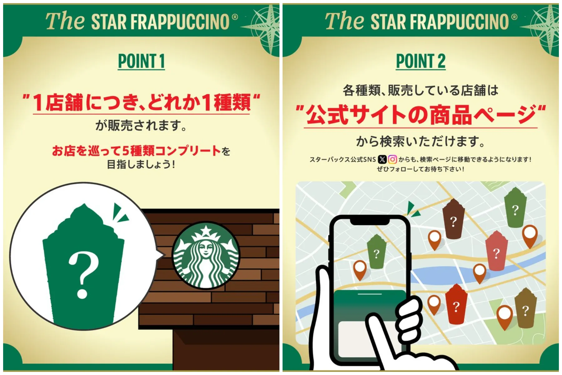『THE STAR フラペチーノ®』は、1つの店舗で出会えるフラペチーノ®はたった1つ。『最寄りのスタバはどの味?』『職場の近くは?』など、MAPを頼りに5つの名作を探して巡れます。店舗ごとに異なる味わいに出会える、30周年ならではのスペシャルなひとときを楽しんでみてください。