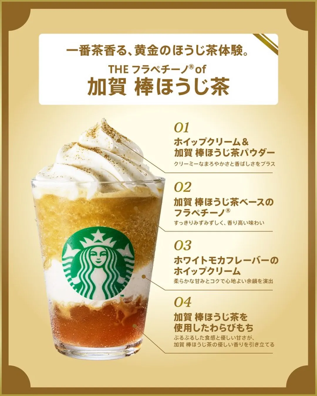 〜一番茶香る、黄金のほうじ茶体験〜100%一番茶を使用した加賀棒ほうじ茶の香ばしさが広がる、和テイストの一杯。ぷるぷる食感のわらび餅がアクセントになり、クリーミーな口当たりの中にやさしい甘みが溶け込みます。「加賀 棒ほうじ茶パウダー」の香りがふんわりと広がり、落ち着いたご褒美時間に寄り添ってくれそうです。