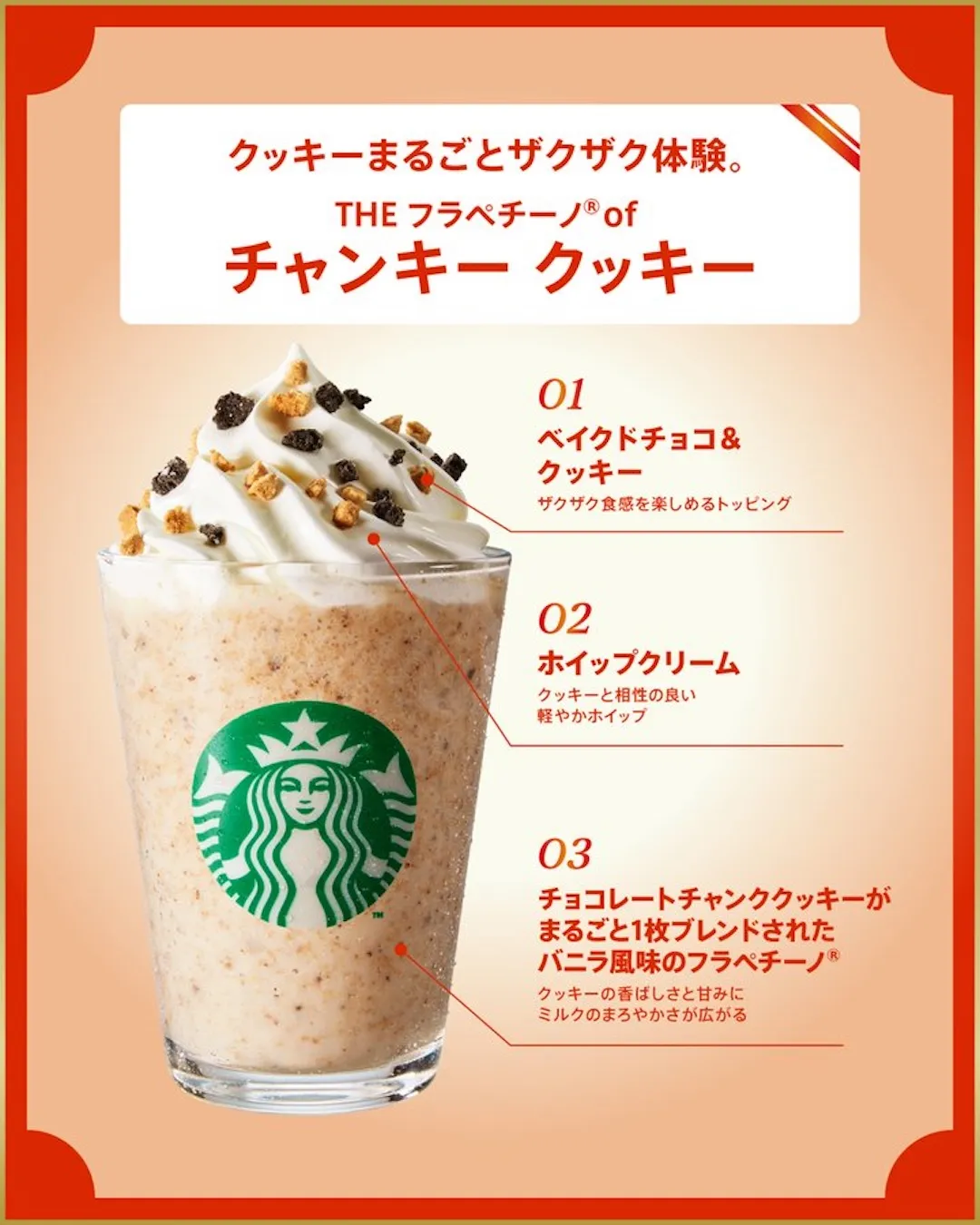 〜クッキーまるごとザクザク体験〜チョコレートチャンククッキーを丸ごとブレンドした、満足感たっぷりのフラペチーノ。ザクザクとした食感とミルキーな甘さが重なり、デザート感覚で楽しめる一杯です。トッピングのクッキーとチョコのアクセントも加わり、最後まで飽きずに楽しめるのも嬉しいポイントです。