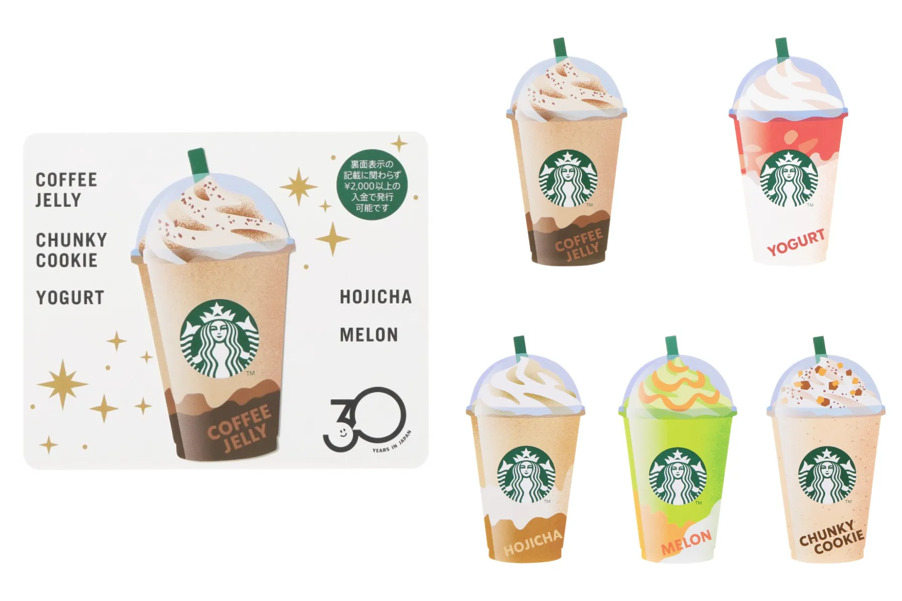 スターバックス コーヒー ジャパン30周年を記念して、『THE スター フラペチーノ®』をモチーフにした、特別なスターバックスカードも登場!全5種類から、お好きなデザインをセレクトできます。