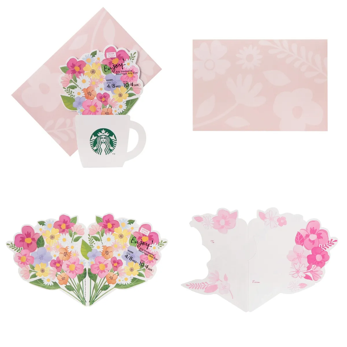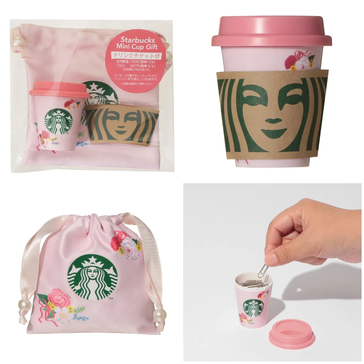 ピンクのカップにお花柄があしらわれた、見た目から心が弾むミニカップギフト。ドリンクチケットとメッセージが添えられて、ちょっとした気持ちを伝えるのにぴったり。ミニカップや巾着は小物入れとしても使え、贈ったあとも楽しめるのが魅力。気軽なのにしっかり可愛い、万能ギフトです。