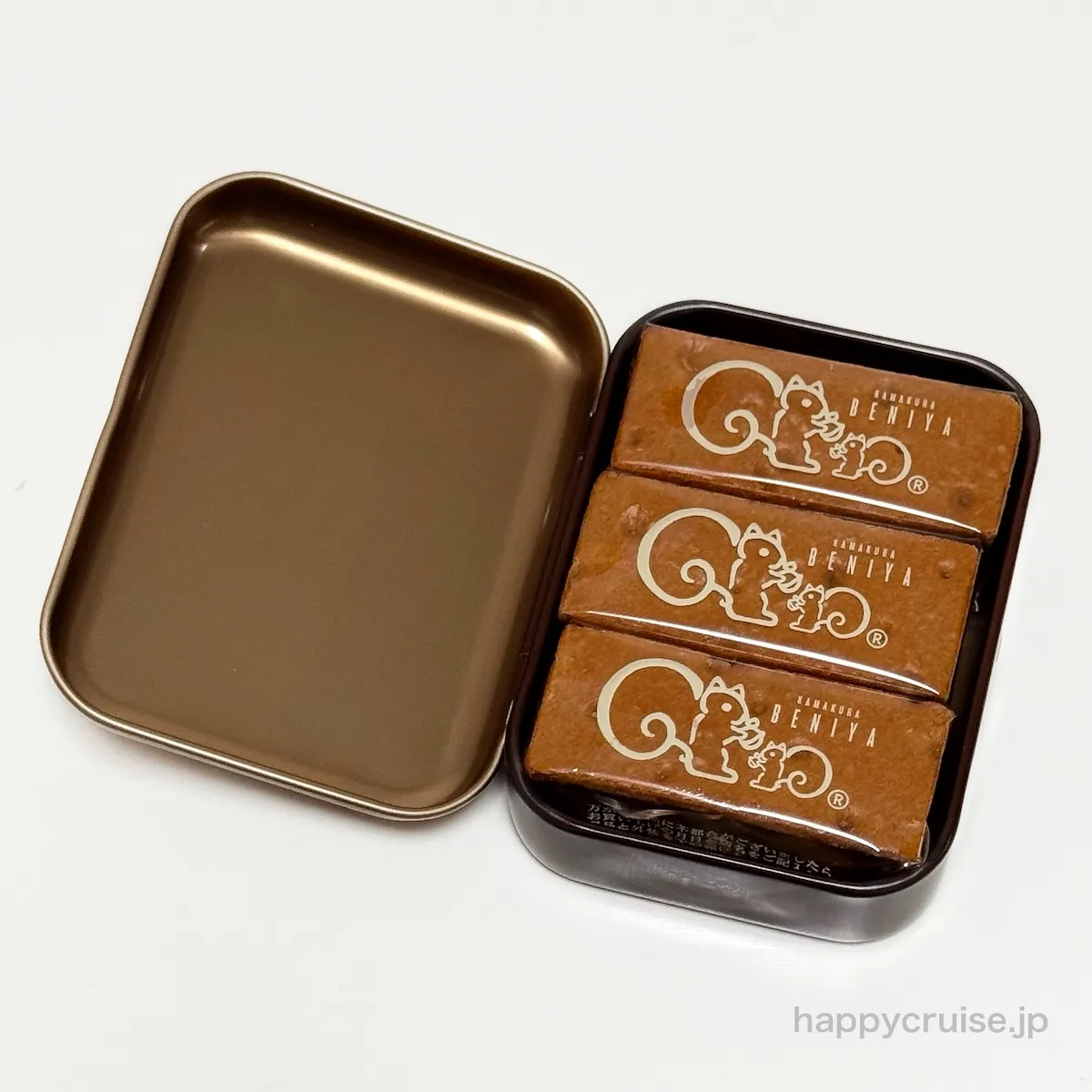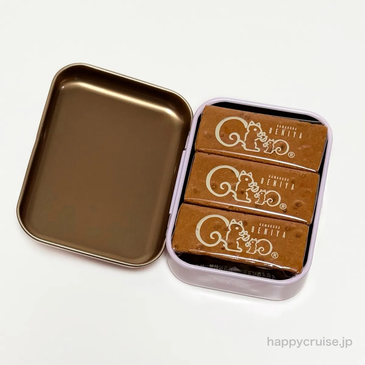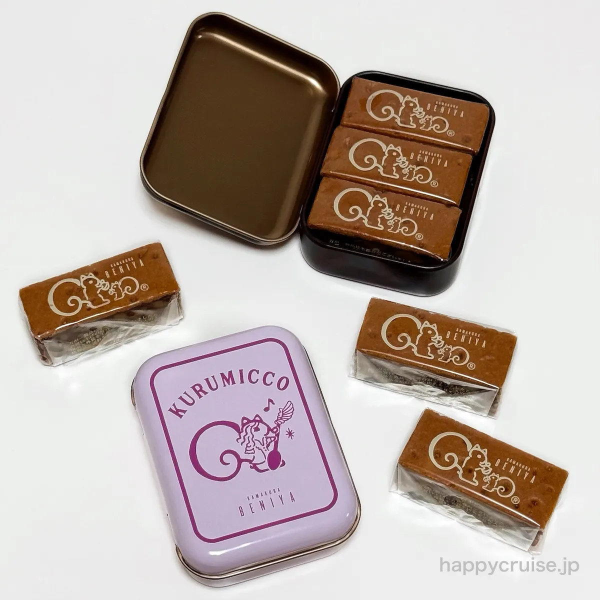 鎌倉紅谷の代表商品「クルミッ子」が1缶に3個ずつ入っています。シンボルキャラクター「リスくん」の個包装デザインにほっこり癒されます。