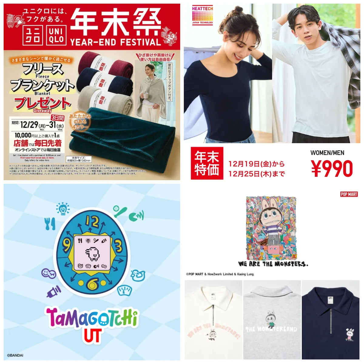 【ユニクロ年末祭2025】最新情報!年末のお楽しみ「ユニクロ年末祭」が2025年12月19日(金)〜31日(水)までの期間限定で、全国のユニクロ店舗およびオンラインストアにて開催されます!年末祭特価アイテムやノベルティ企画のほか、年末祭第一弾には「たまごっちUT&トイ」、年末祭第二弾には「POP MART UT(ラブブ)」も登場します。「ユニクロ年末祭」の注目ポイントをまるっとご紹介しますので、ぜひチェックしてみてください。
