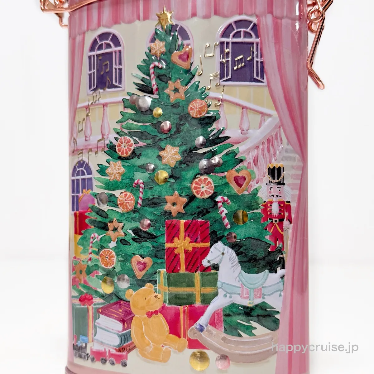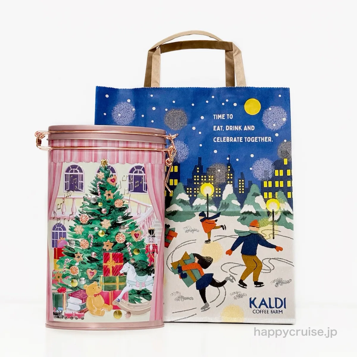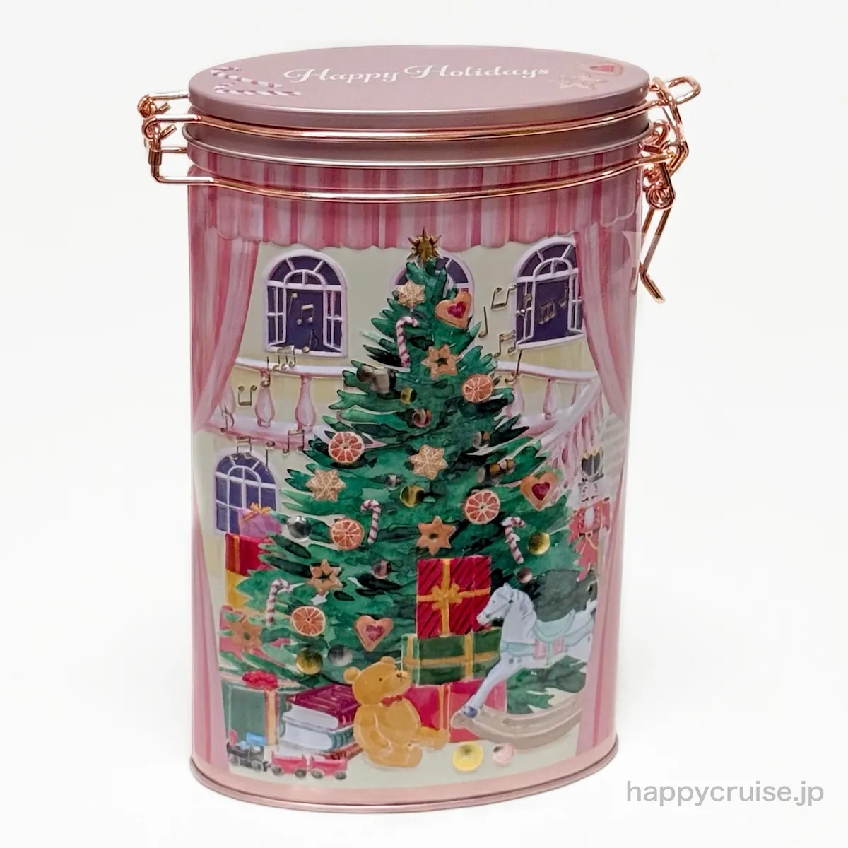 クリスマスモチーフのイラストを散りばめた、カルディオリジナルのキャニスター缶。今年はピンクを基調とした大人かわいいデザインです。
