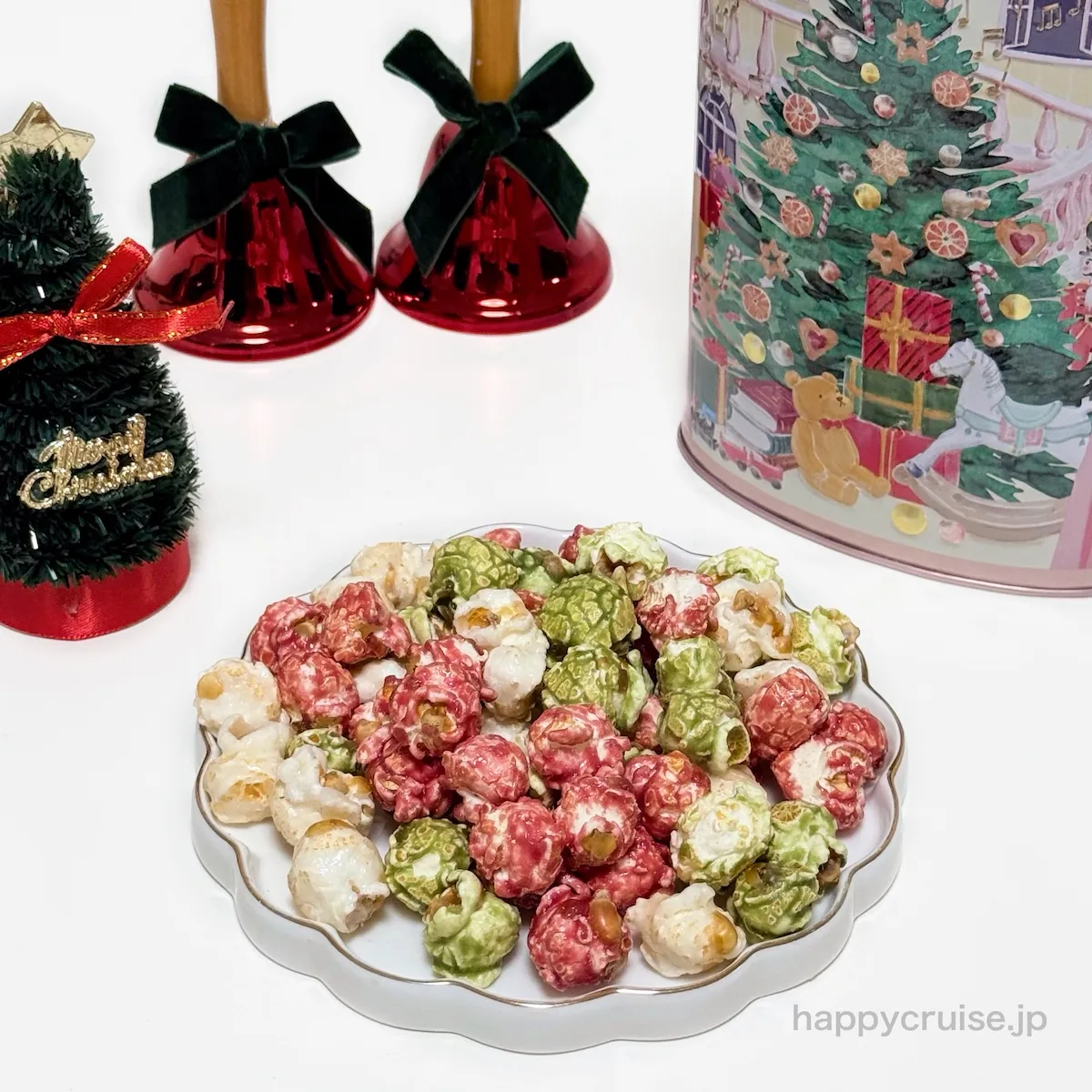 見た目にもかわいいカラフルなキャンディポップコーン。バニラ味、イチゴ味、抹茶味、3種のフレーバーを楽しめます。ポップコーンの賞味期限は2026年1月31日まで。