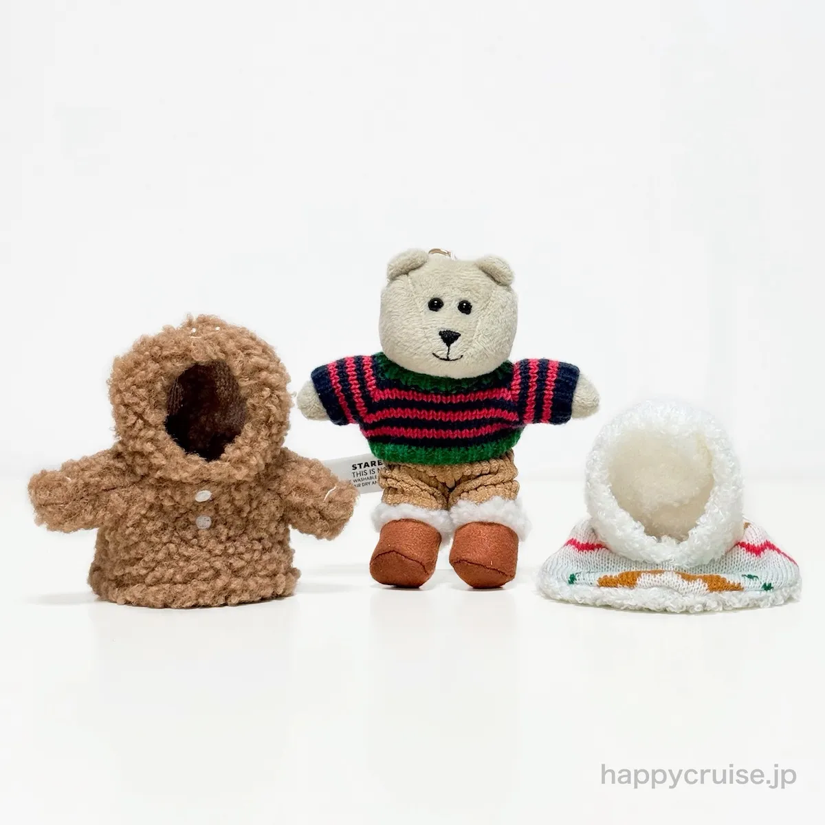 ホリデー2025のベアリスタMiniセットは、なんと!着せ替え仕様。ニットを着たベアリスタと一緒に、着脱できるアウター2点がついてきます。