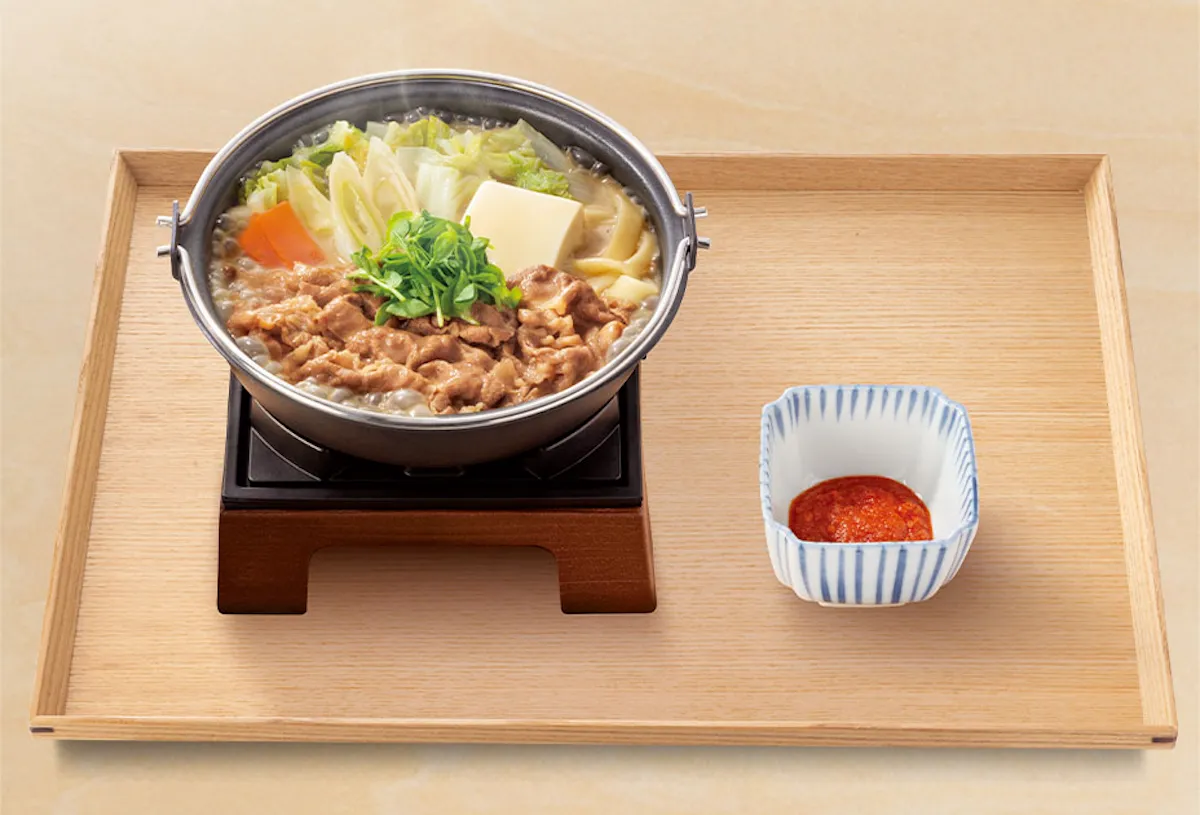 昆布・かつお節・椎茸のだしに牛のエキスを重ねた特製すきやきだれに香り高くアップデート。大判のすきやき肉と白菜・ねぎ・豆苗・人参・絹豆腐・きしめんを熱々で提供します。卵でまろやかにして頬張れば、半日分の野菜がしっかり摂れて心もお腹も満足度UP。