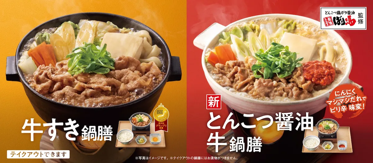 累計1億食の販売数を突破した季節商品人気No.1の『牛すき鍋膳』が今年も登場です!さらに、広島発ラーメンブランド「ばり嗎」と初めてコラボレーションした新商品「ばり嗎監修とんこつ醤油牛鍋膳」も同時販売。鍋膳はご飯増量・おかわり無料なので、秋冬のスタミナチャージにぴったりです。